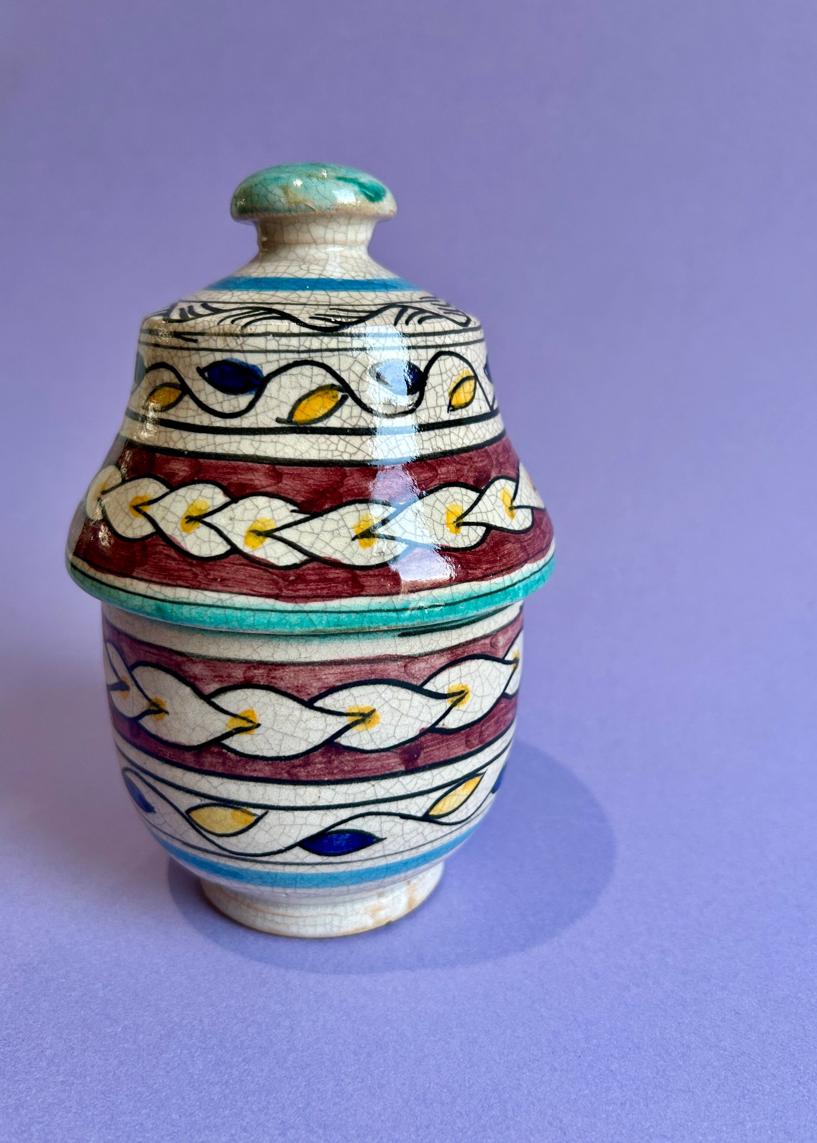 蓋からボディの中央へのシェイプが美しく、アンティークのフェズ陶器にしかない唯一無二の逸品です。