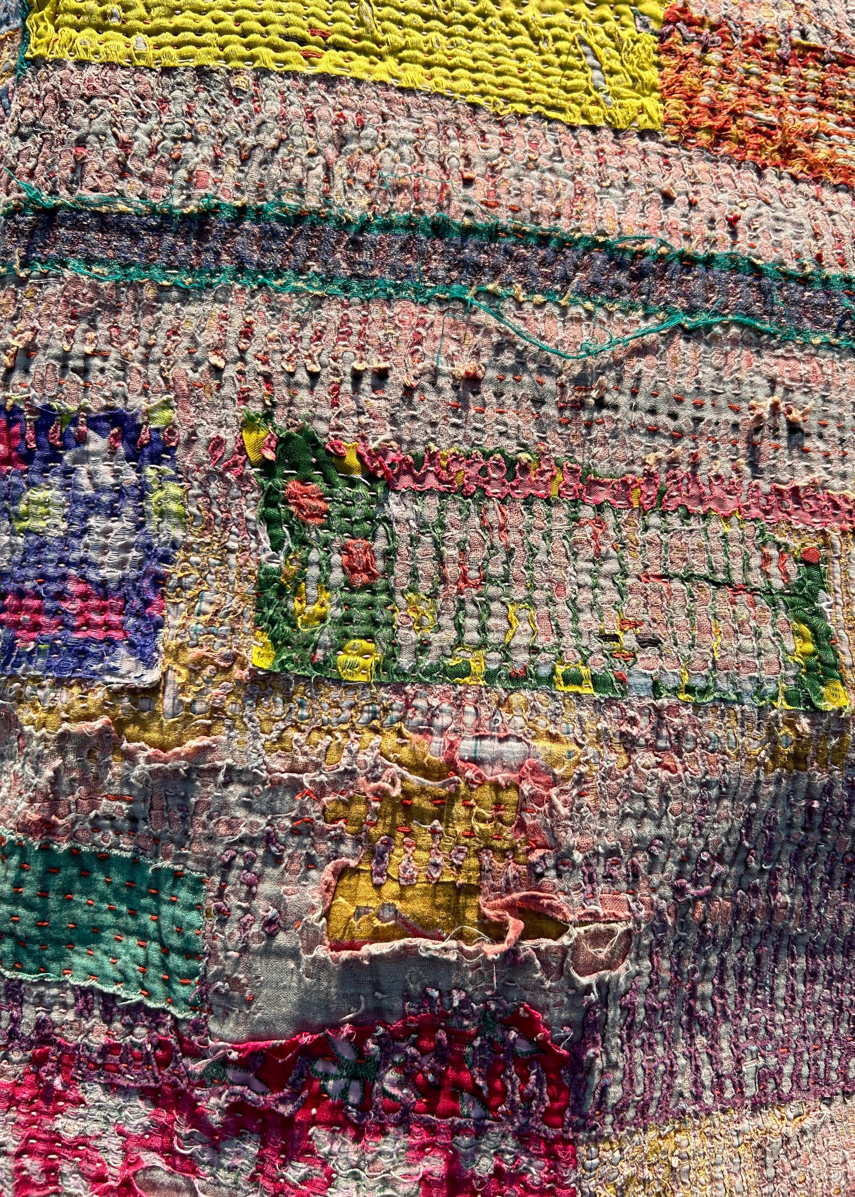 このカンタキルトは全体的に布の表面の擦れによる破れで現れた裏地の質感がヴィンテージならではの逸品で、カンタキルトらしい布が繋ぐアートな1枚になっています。