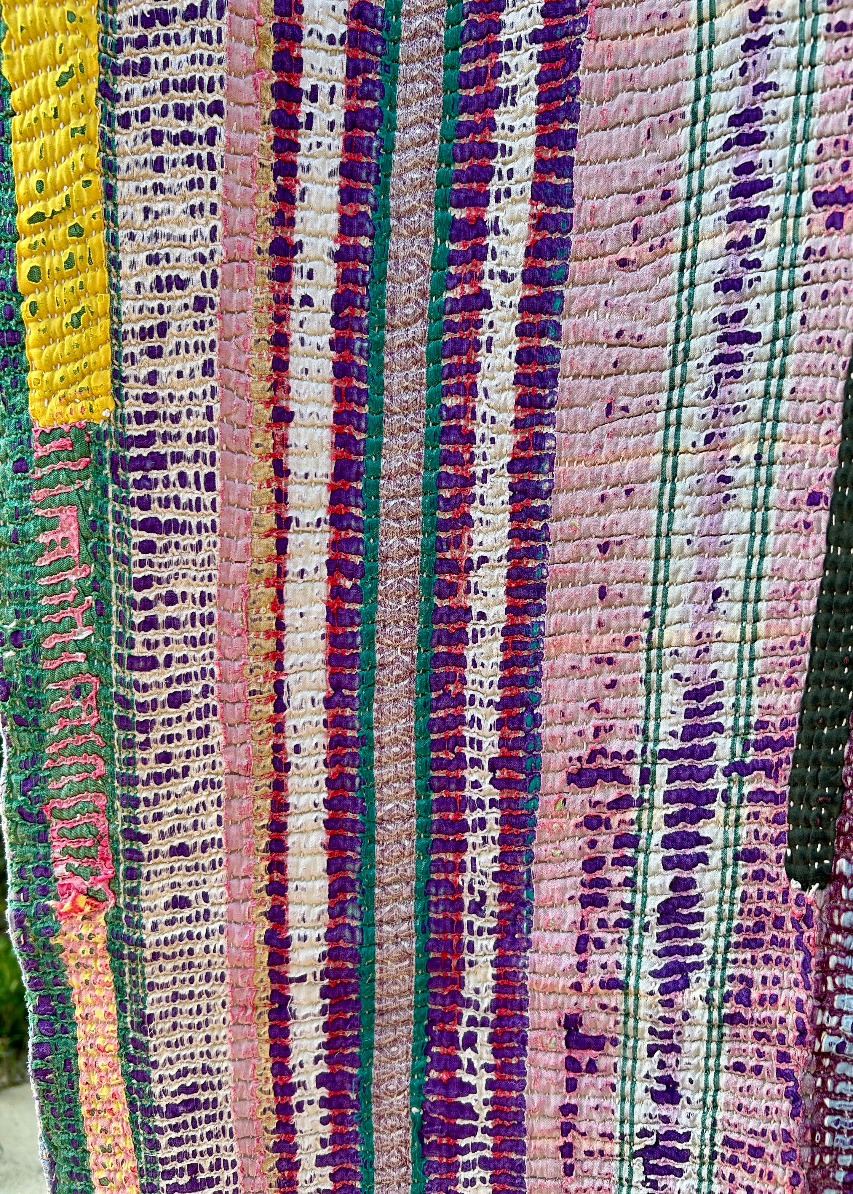 縦のラインにパッチが繋ぎ合わされたラリーキルトで、全体的に布の表面の擦れによる破れで重ねた裏地が見えており、淡く美しいカラーリングと質感がヴィンテージカンタキルトらしいアートな1枚です。
