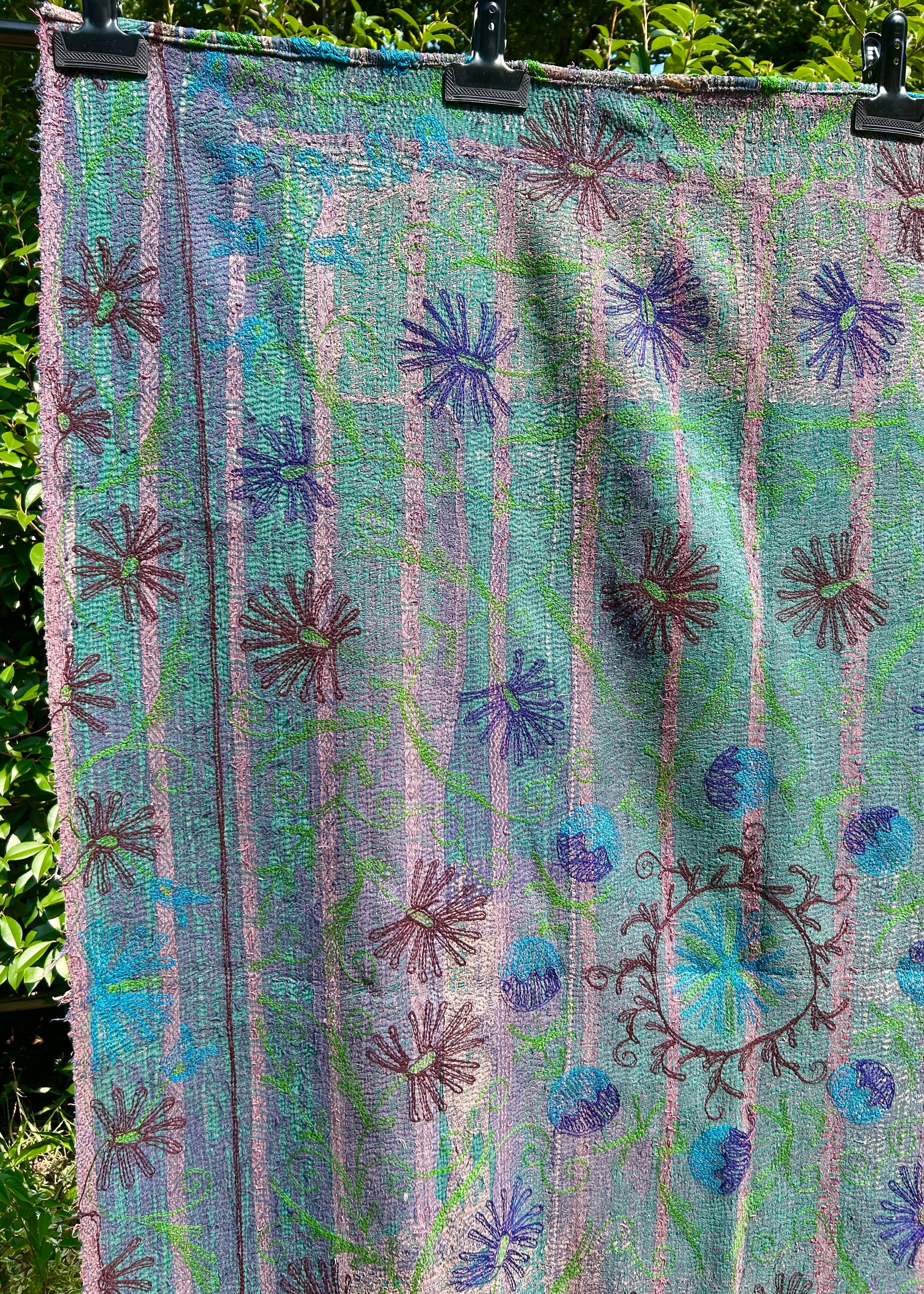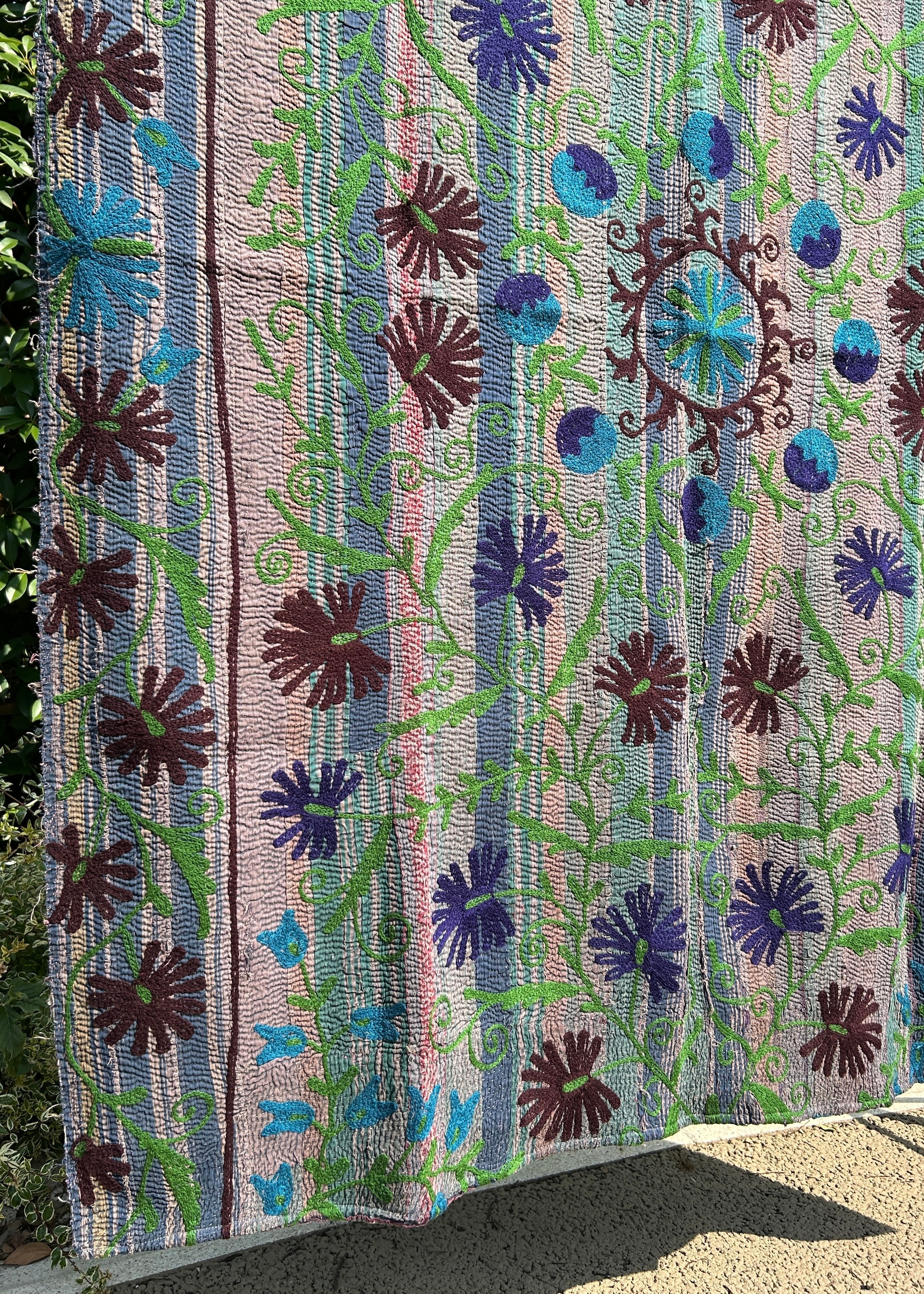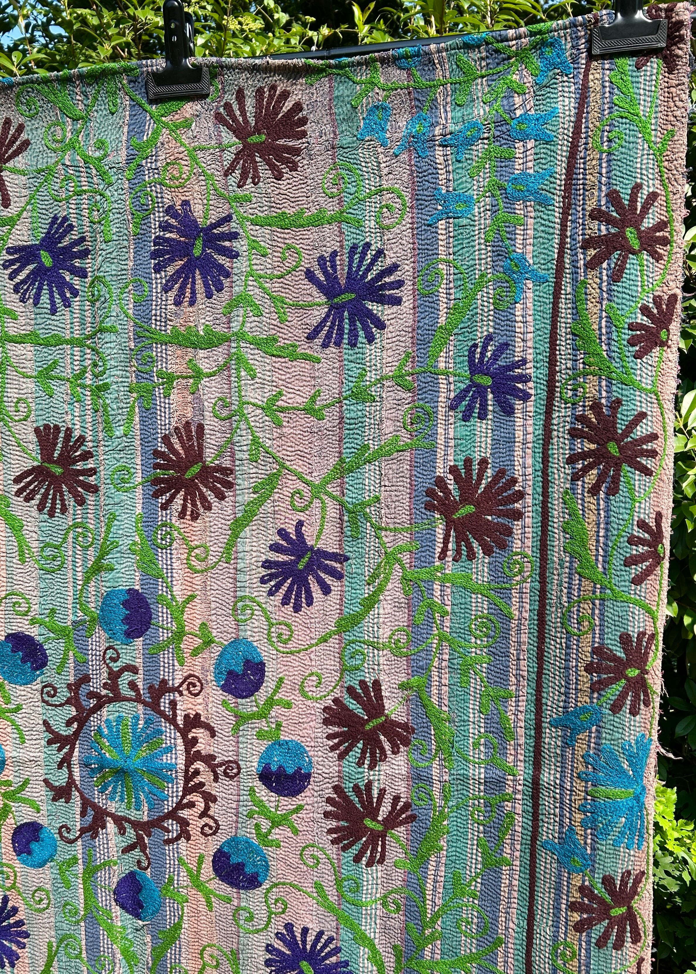 カンタキルトの細かい刺し子の刺繍に加え、カシミール刺繍(太いかぎ針を使ったアリ刺繍)が大胆に絵柄として表現されることで、カンタキルトがより一層アートな1枚に変身しています。