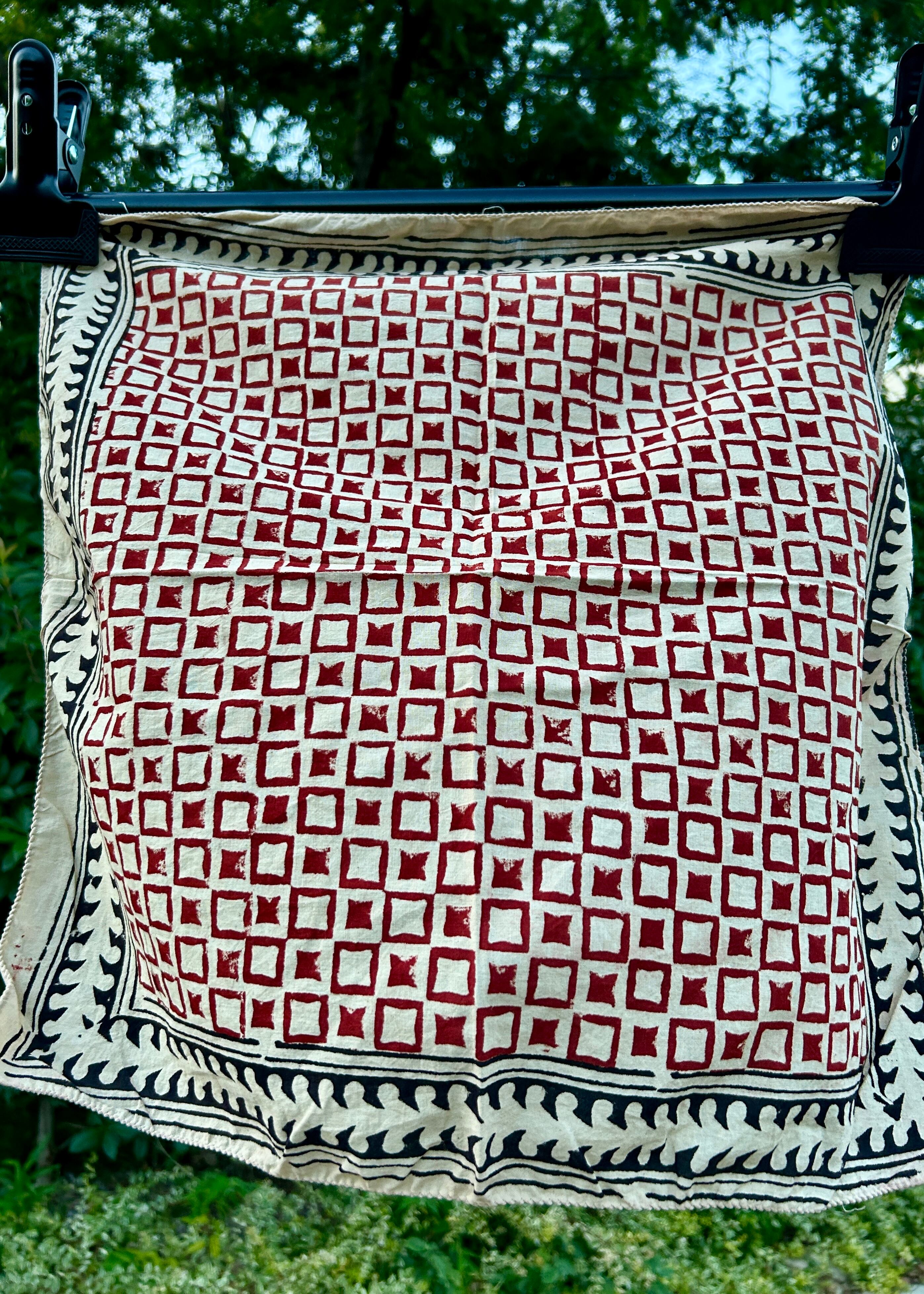 バグループリントは藍色と茜色を基調としたシンプルな色合わせで、ラジャスタンの砂漠から生まれる素朴な風合いです。