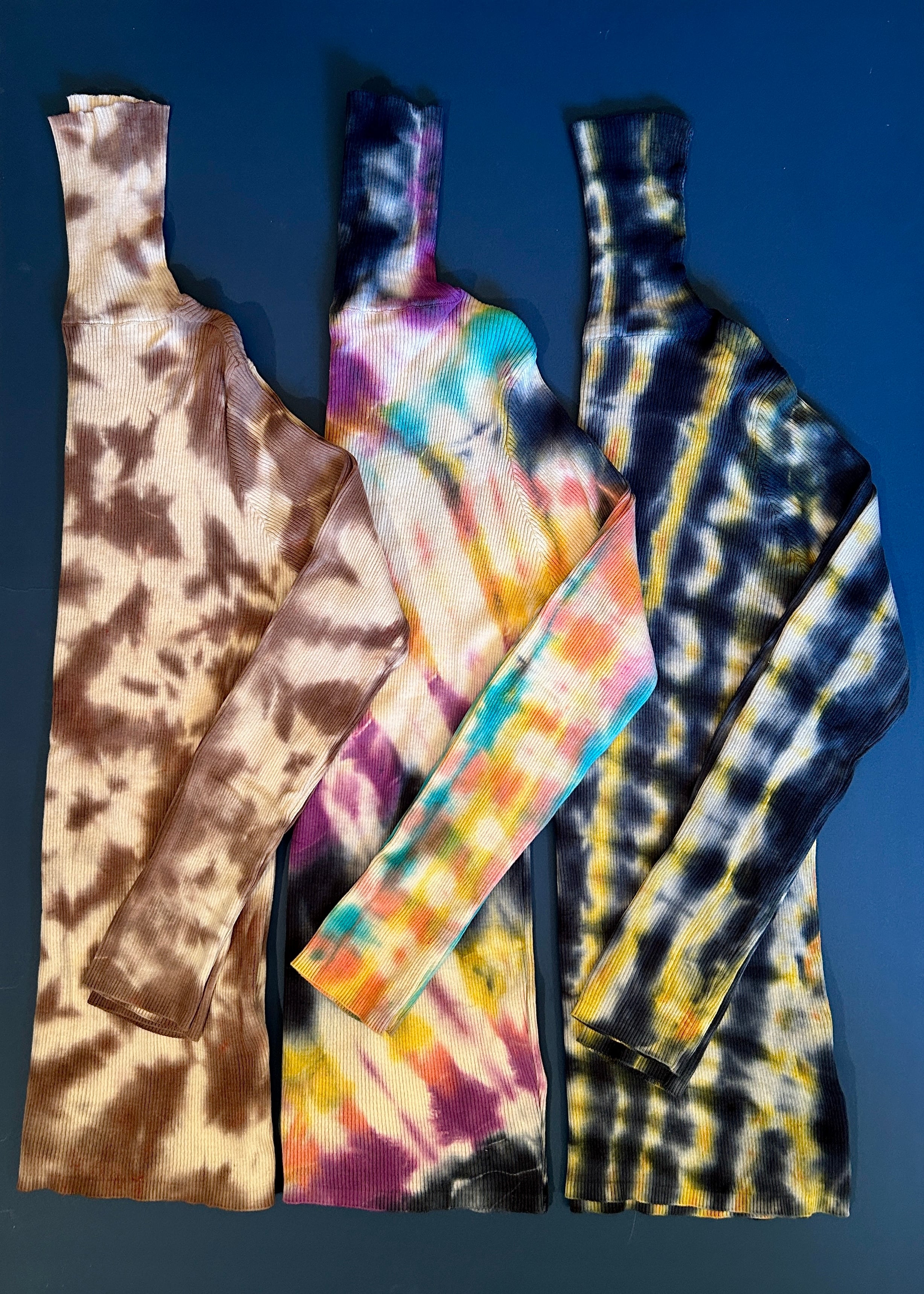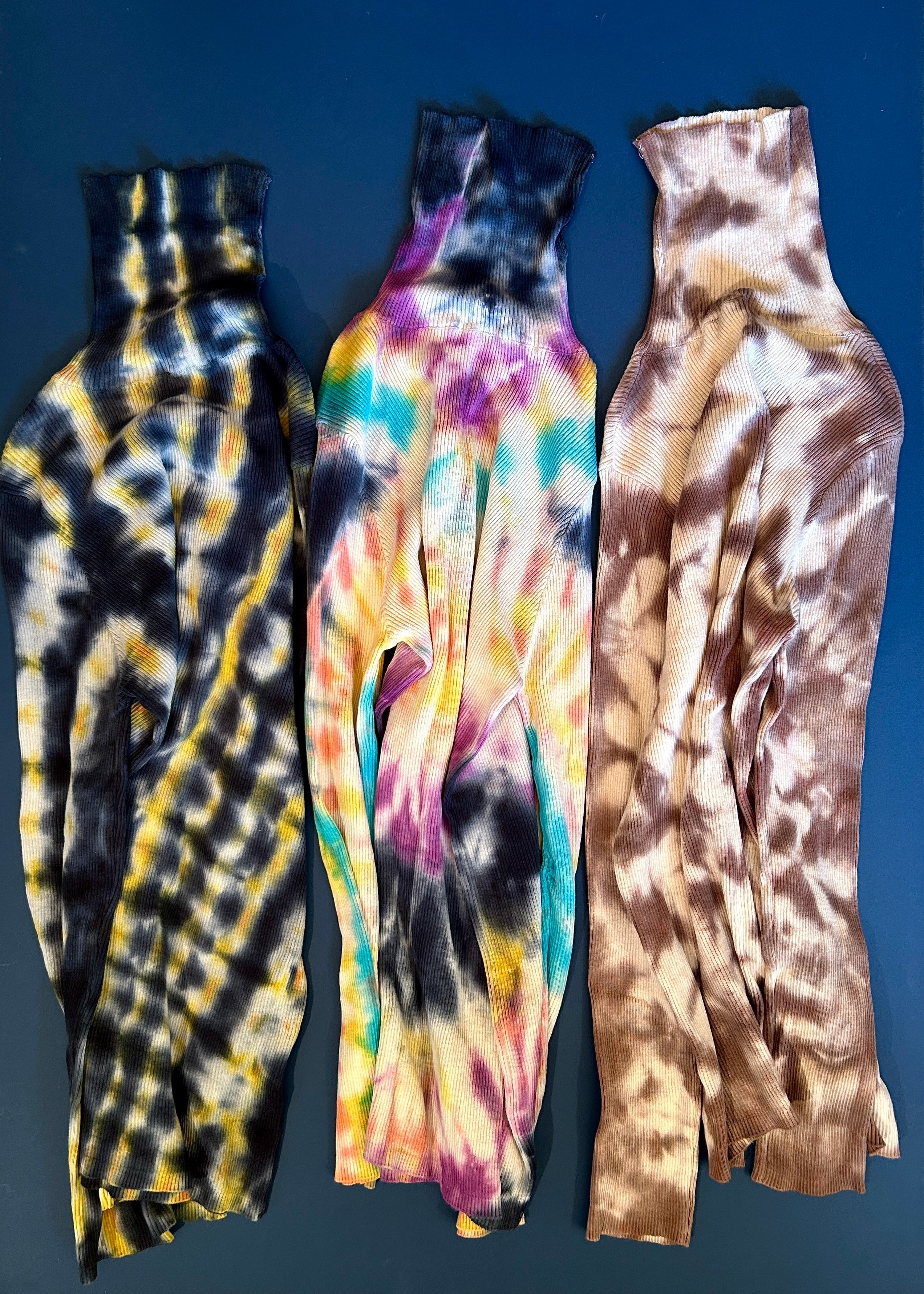 多様なカルチャーからインスパイアされた独自のタイダイ染め・絞り染め技法で1枚1枚手染めしました。
