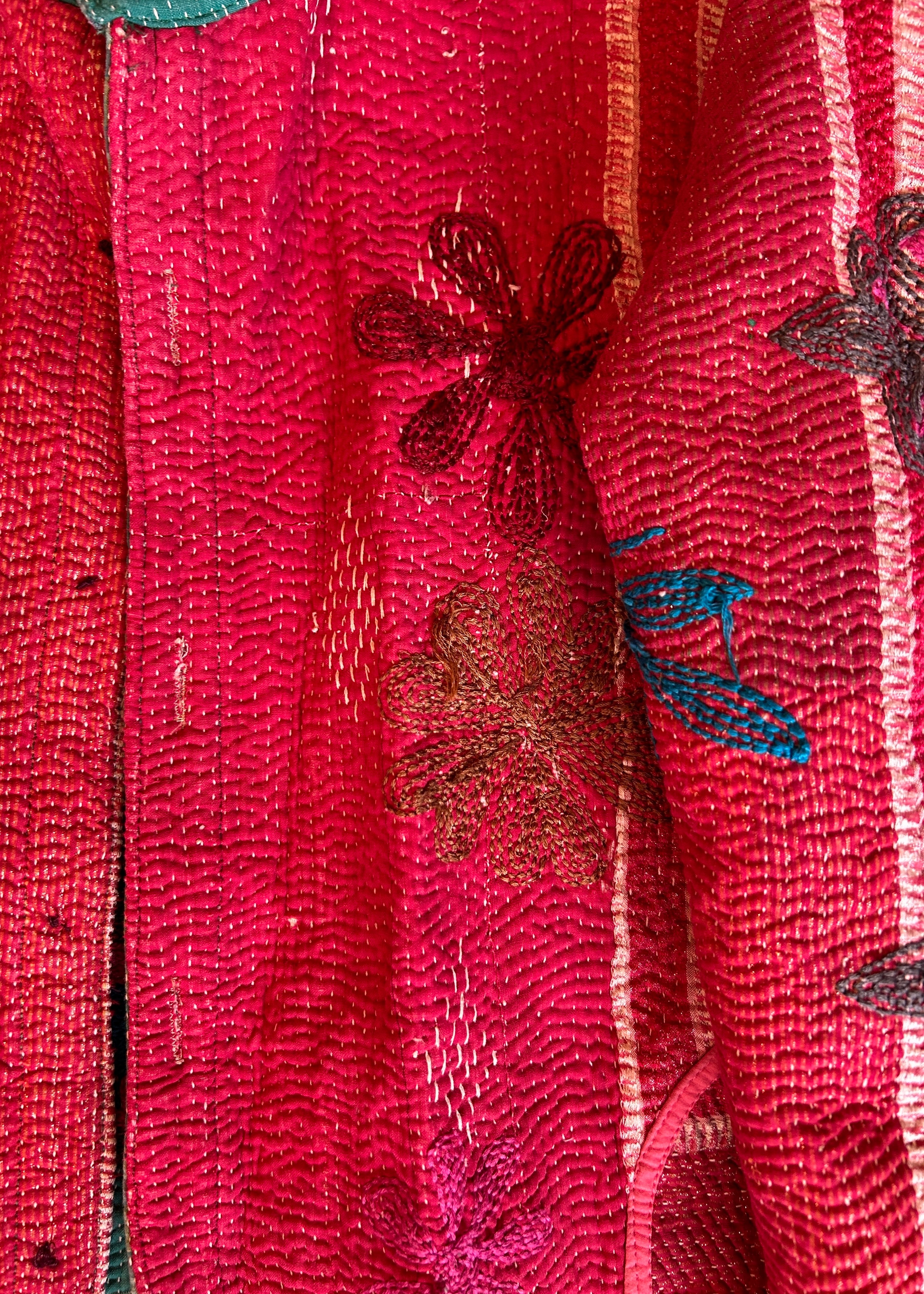 テキスタイル大国インド、ラジャスタン州のジャイプール。カンタキルトを数百枚と物色する中、一際目を惹いたのが、ヴィンテージのカンタキルトにカシミール刺繍(東アジアではアリ刺繍・スザニ刺繍とも呼ばれる)が施されたプロダクトです。