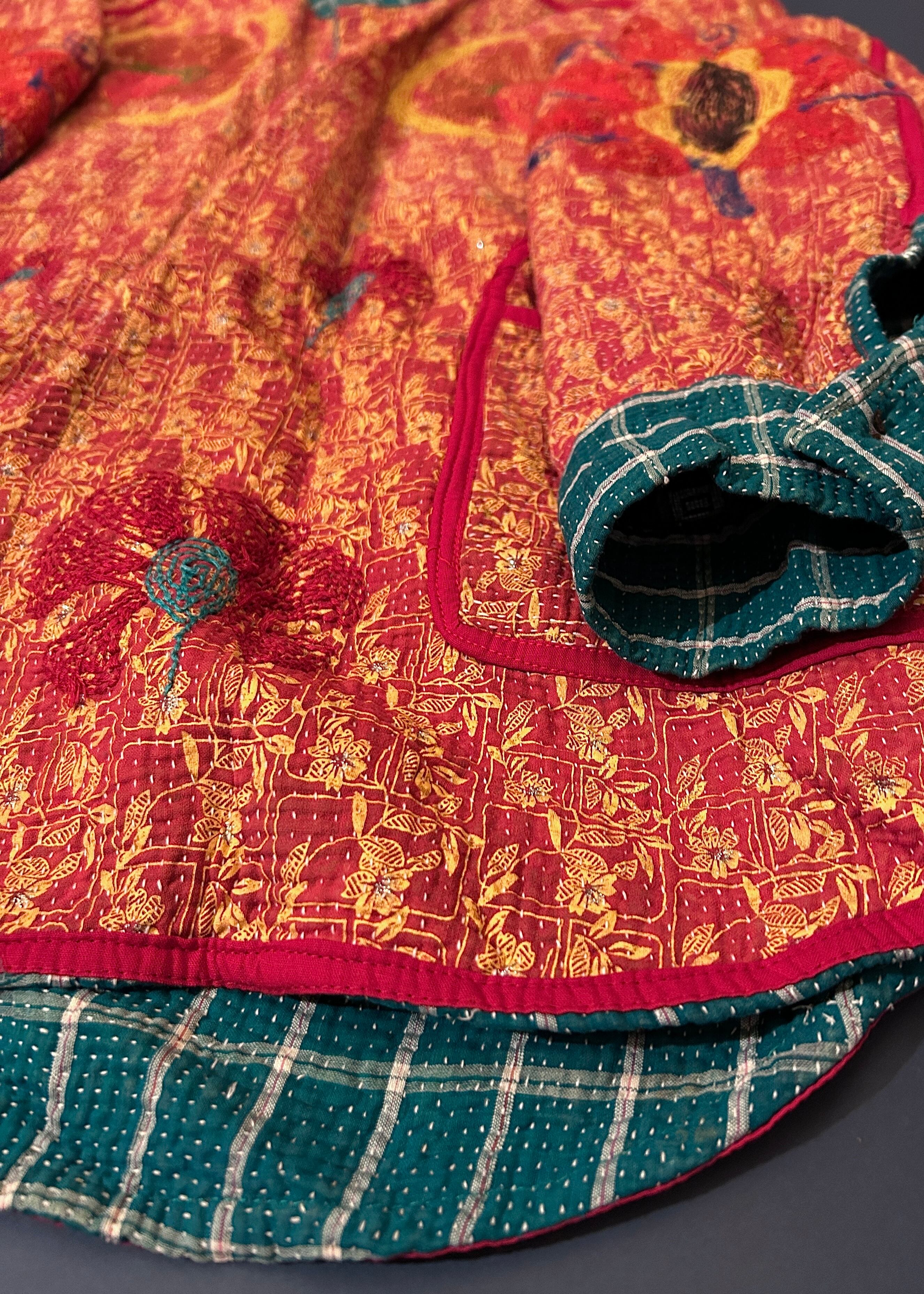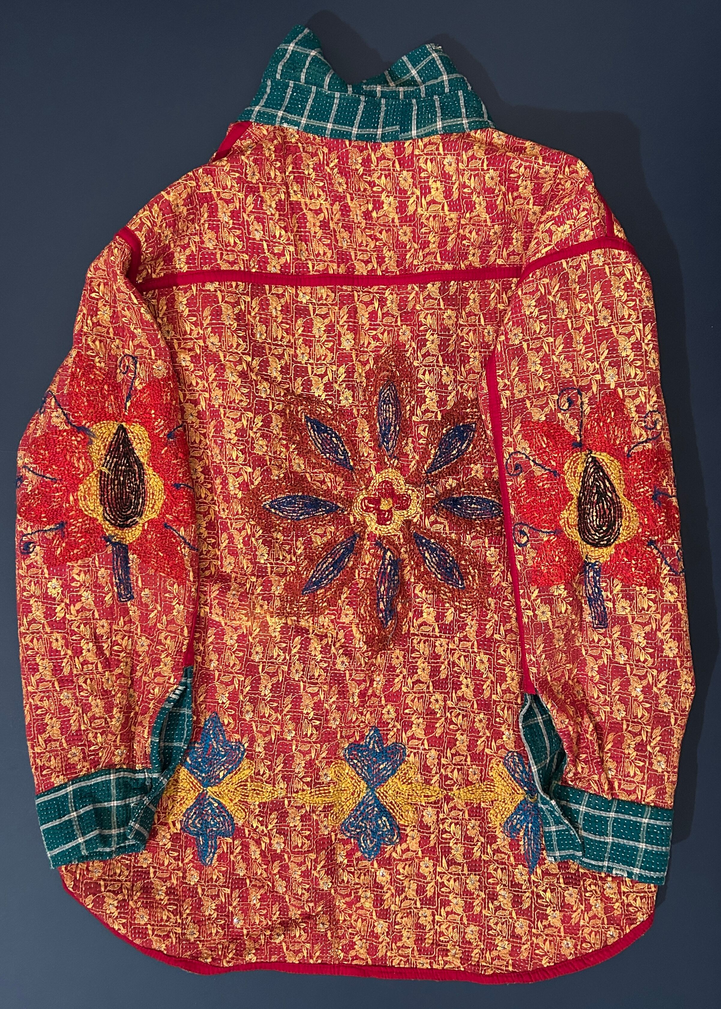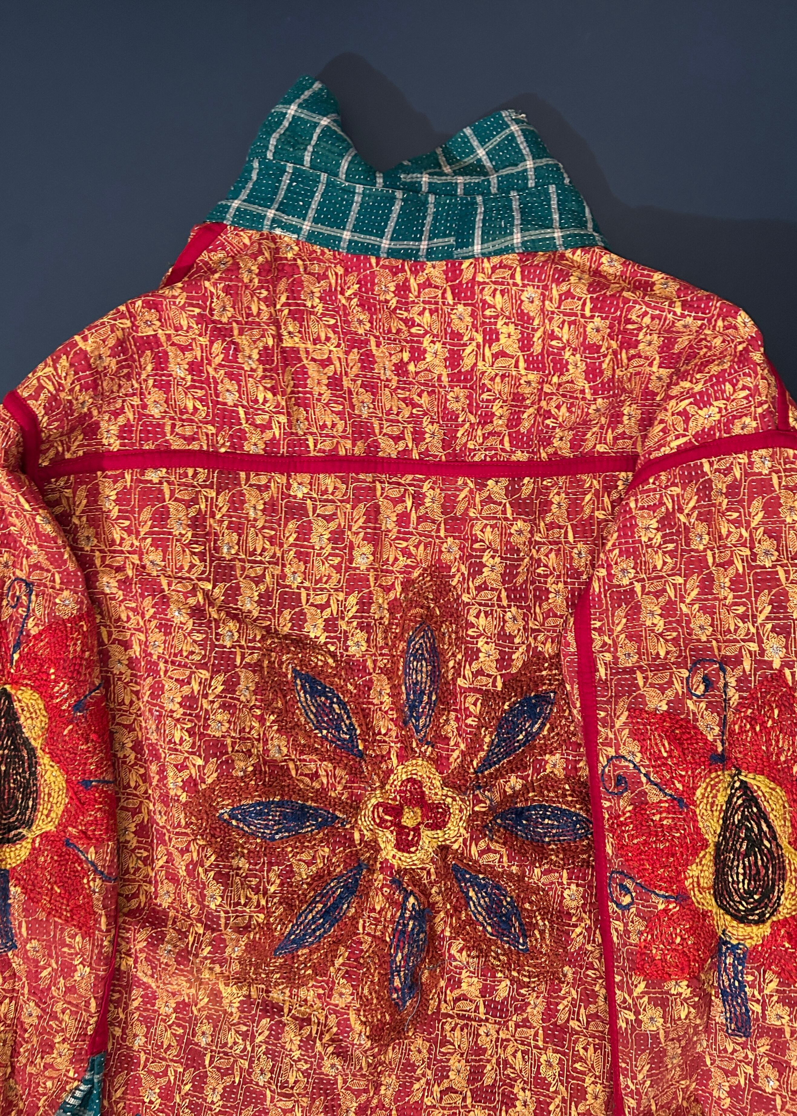 羽織ったときに見える裏の赤いカンタ生地は黄色い小花柄がプリントされており、ちいさなストーンがついている珍しいディテールです。