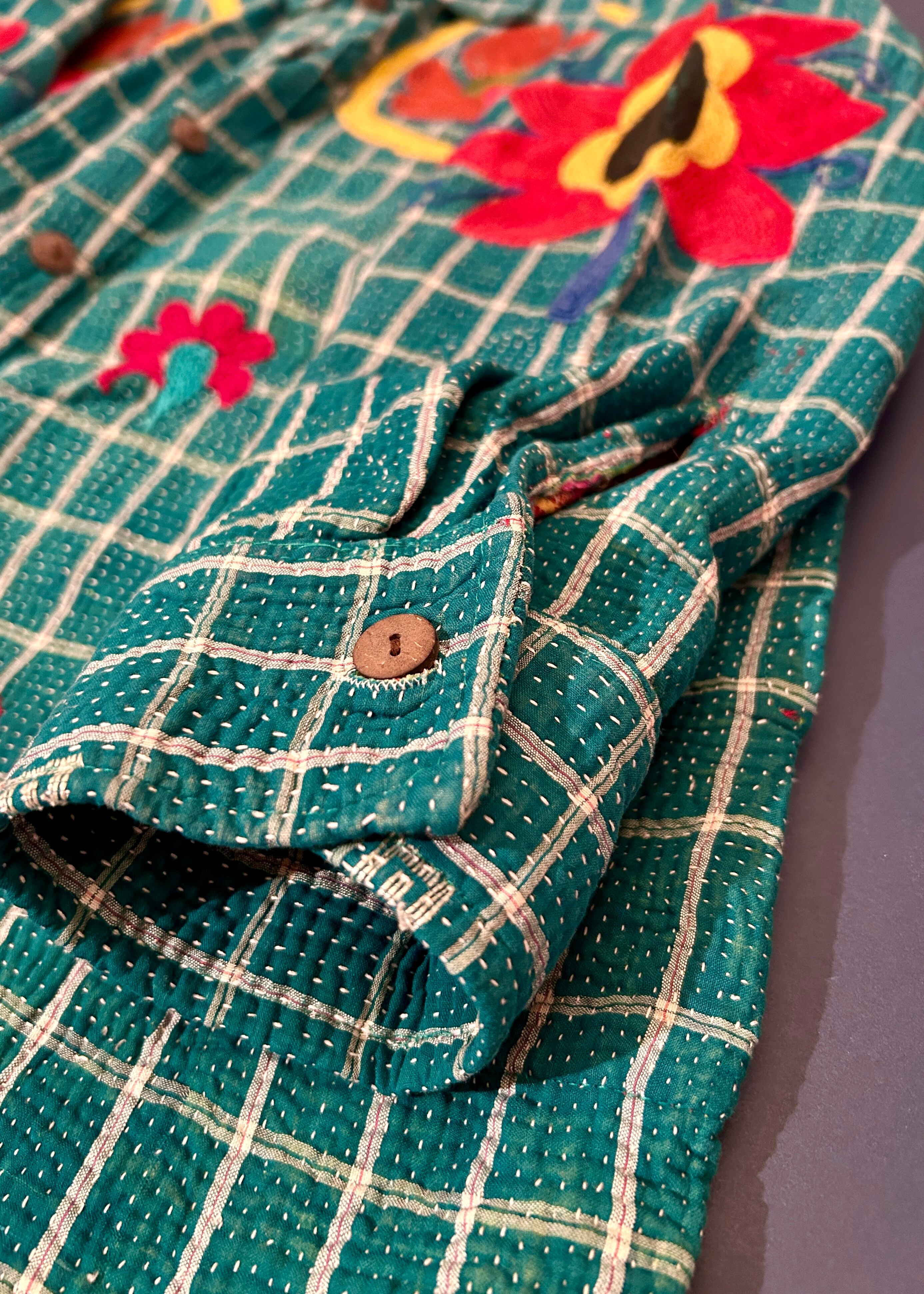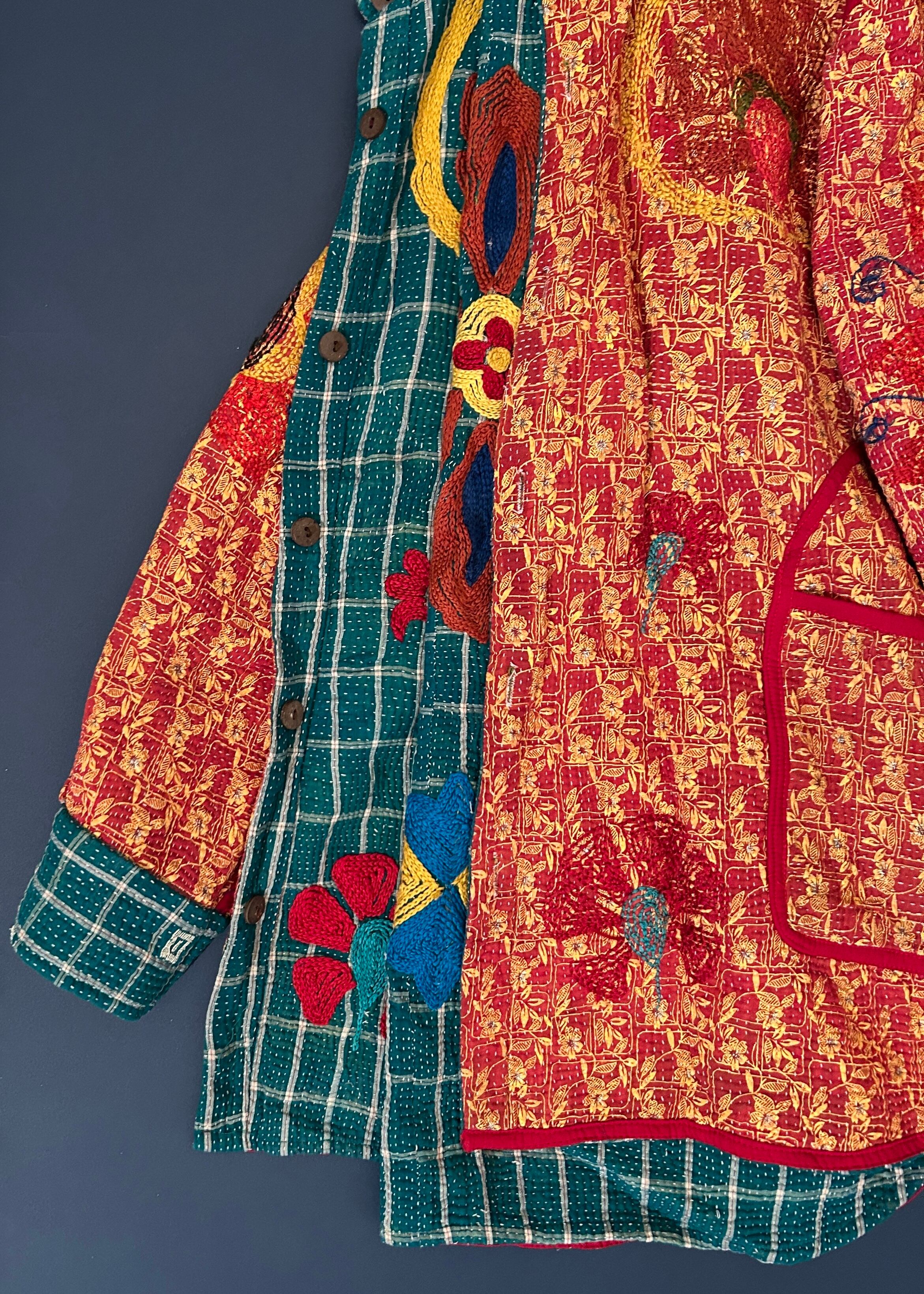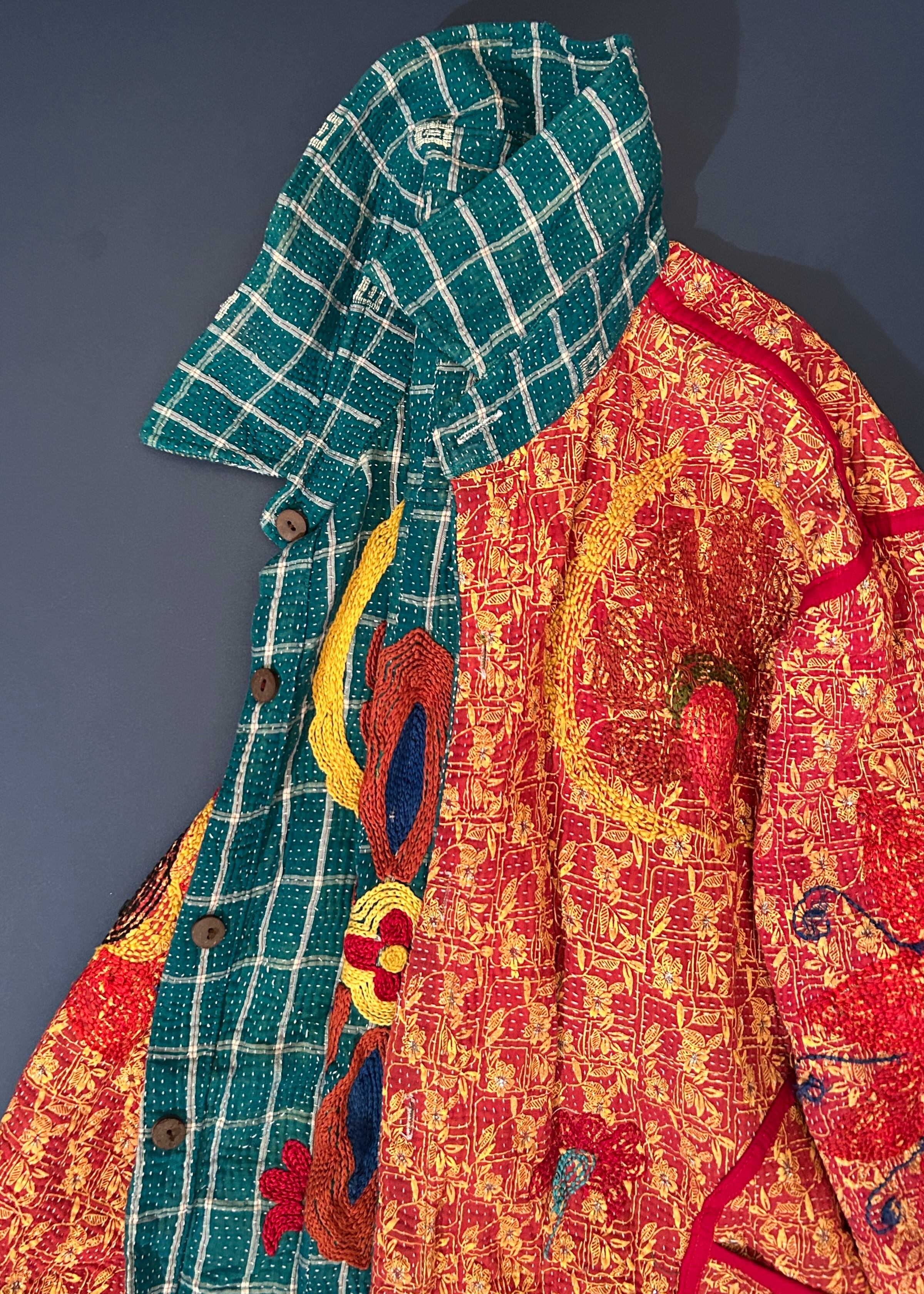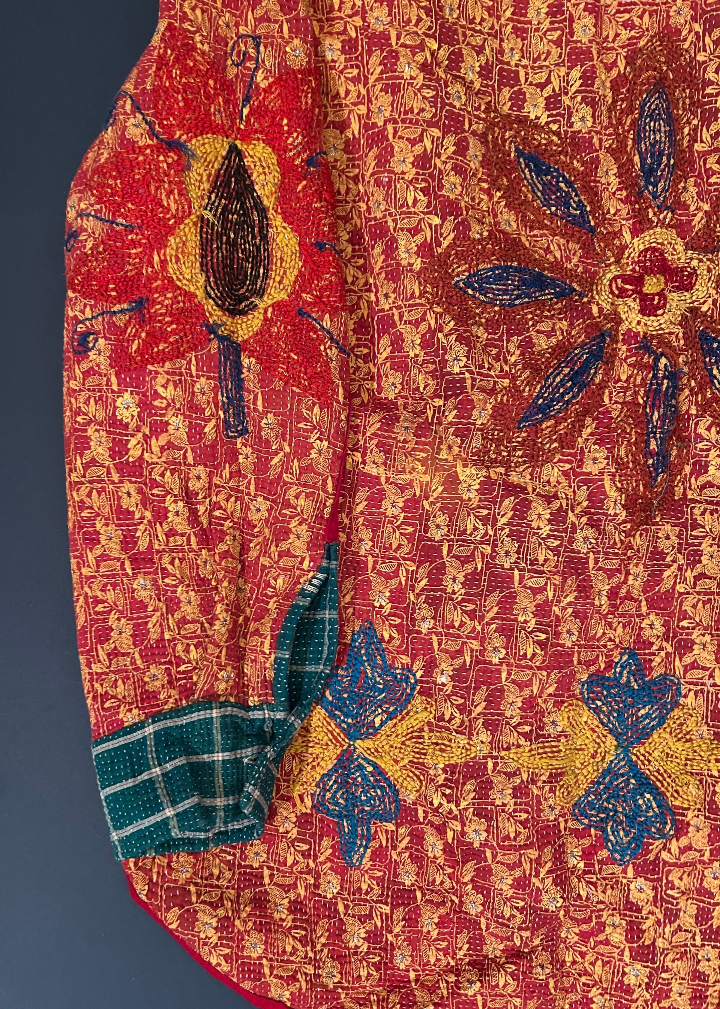テキスタイル大国インド、ラジャスタン州のジャイプール。カンタキルトを数百枚と物色する中、一際目を惹いたのが、ヴィンテージのカンタキルトにカシミール刺繍(東アジアではアリ刺繍・スザニ刺繍とも呼ばれる)が施されたプロダクトです。
