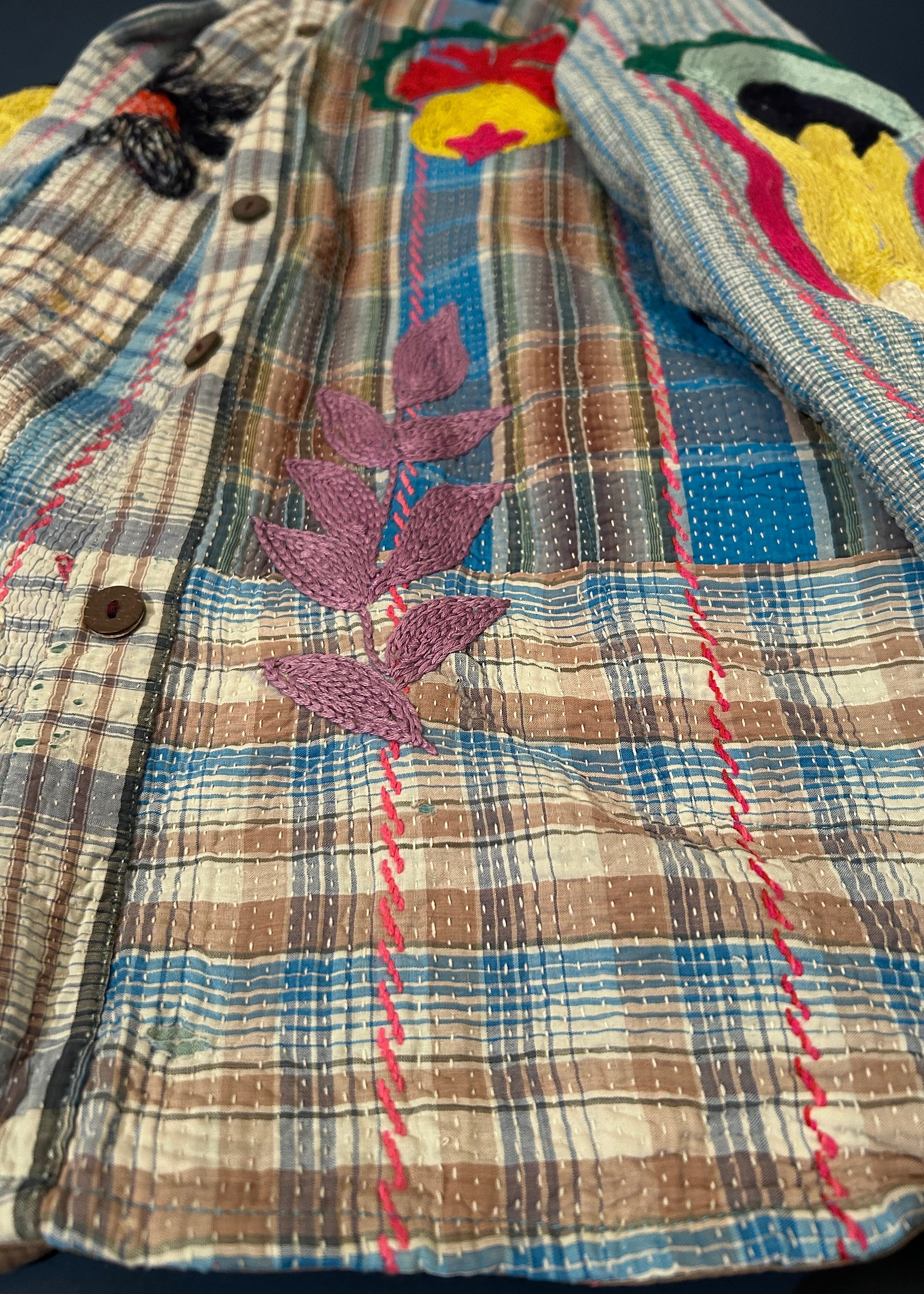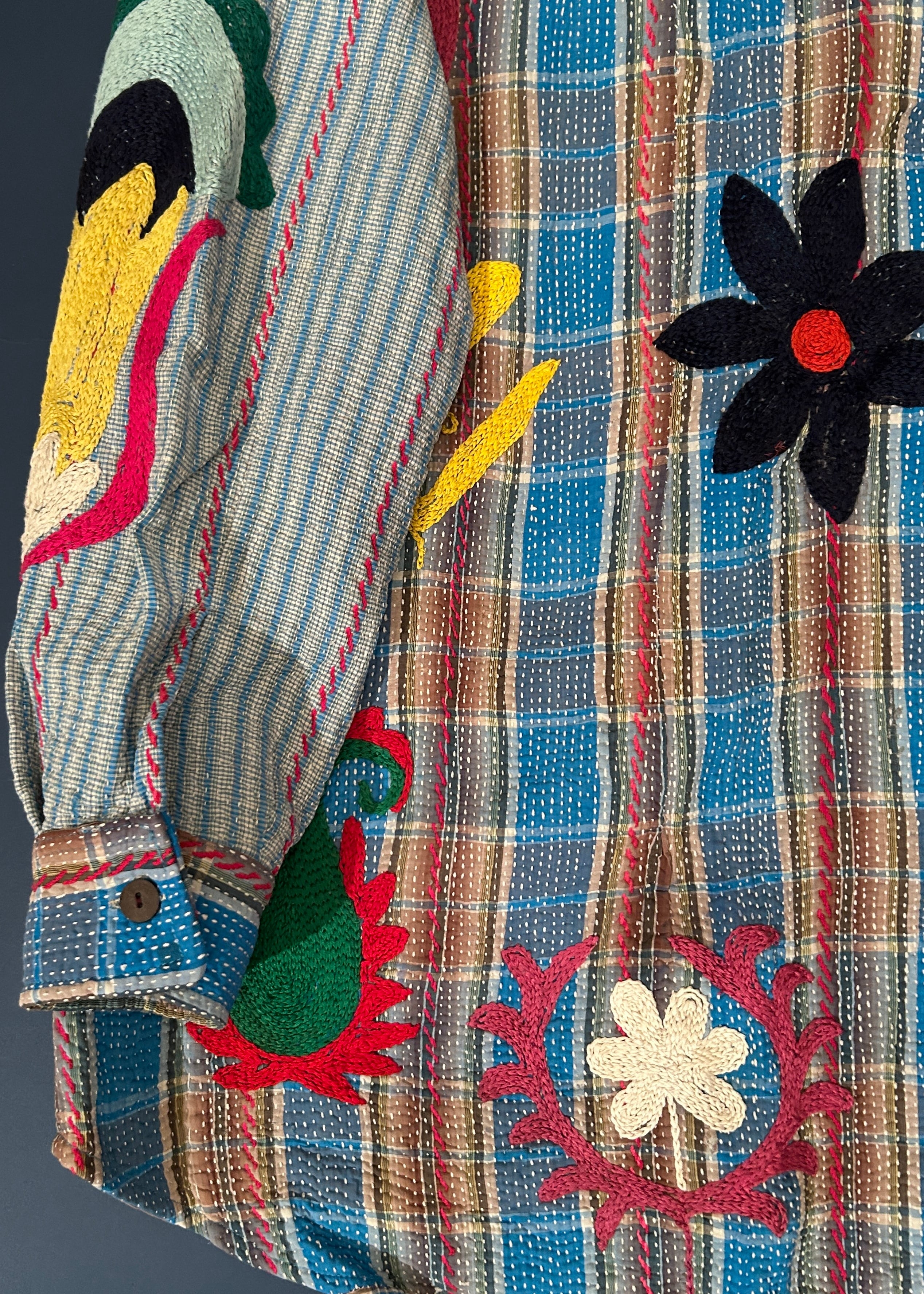テキスタイル大国インド、ラジャスタン州のジャイプール。カンタキルトを数百枚と物色する中、一際目を惹いたのが、ヴィンテージのカンタキルトにカシミール刺繍(東アジアではアリ刺繍・スザニ刺繍とも呼ばれる)が施されたプロダクトです。