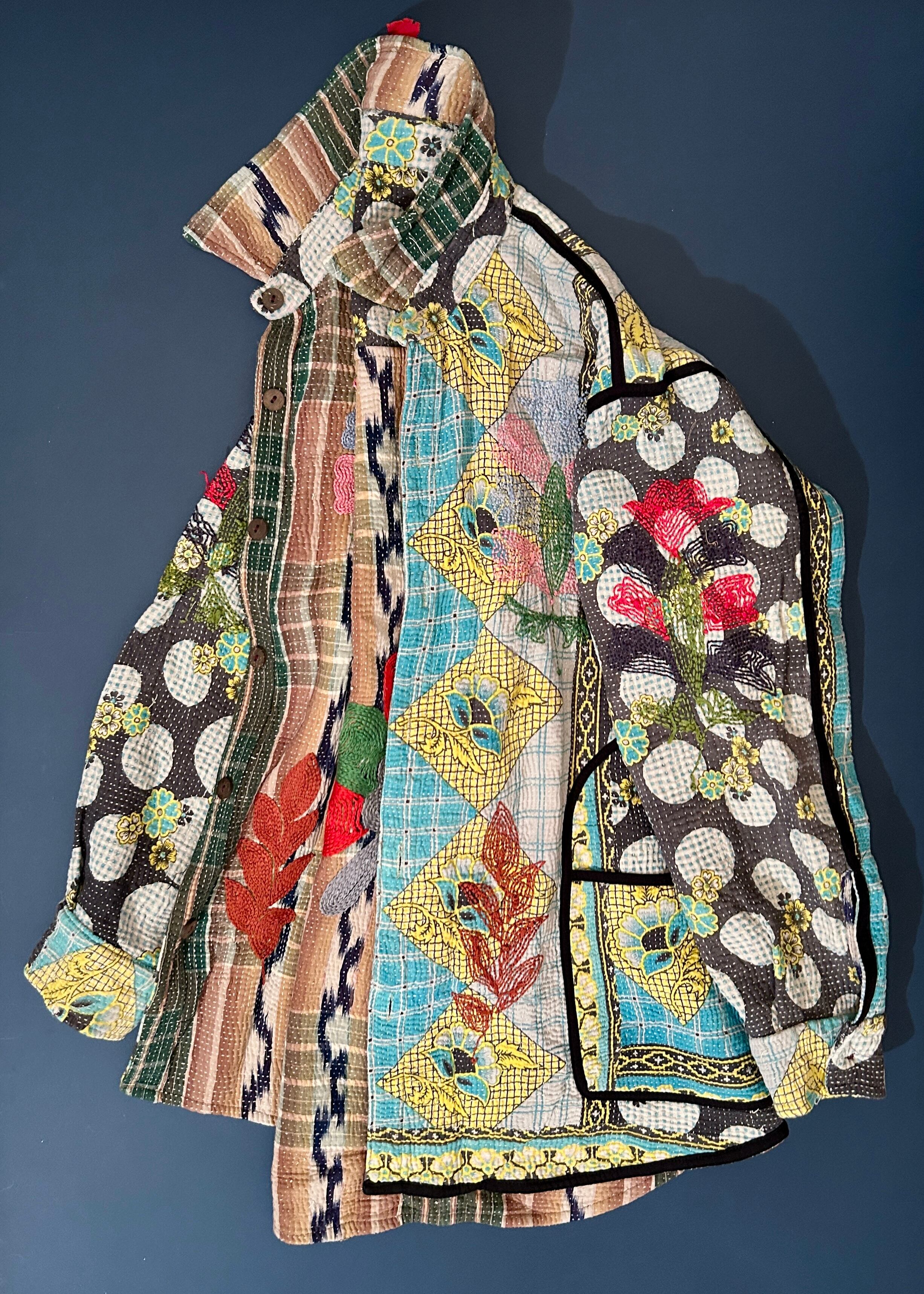 ★こちらのデザインは複数の柄が使用され、正面、後ろ姿、裏地、すべてにカンタキルトの素敵なポイントが詰まった1枚です。