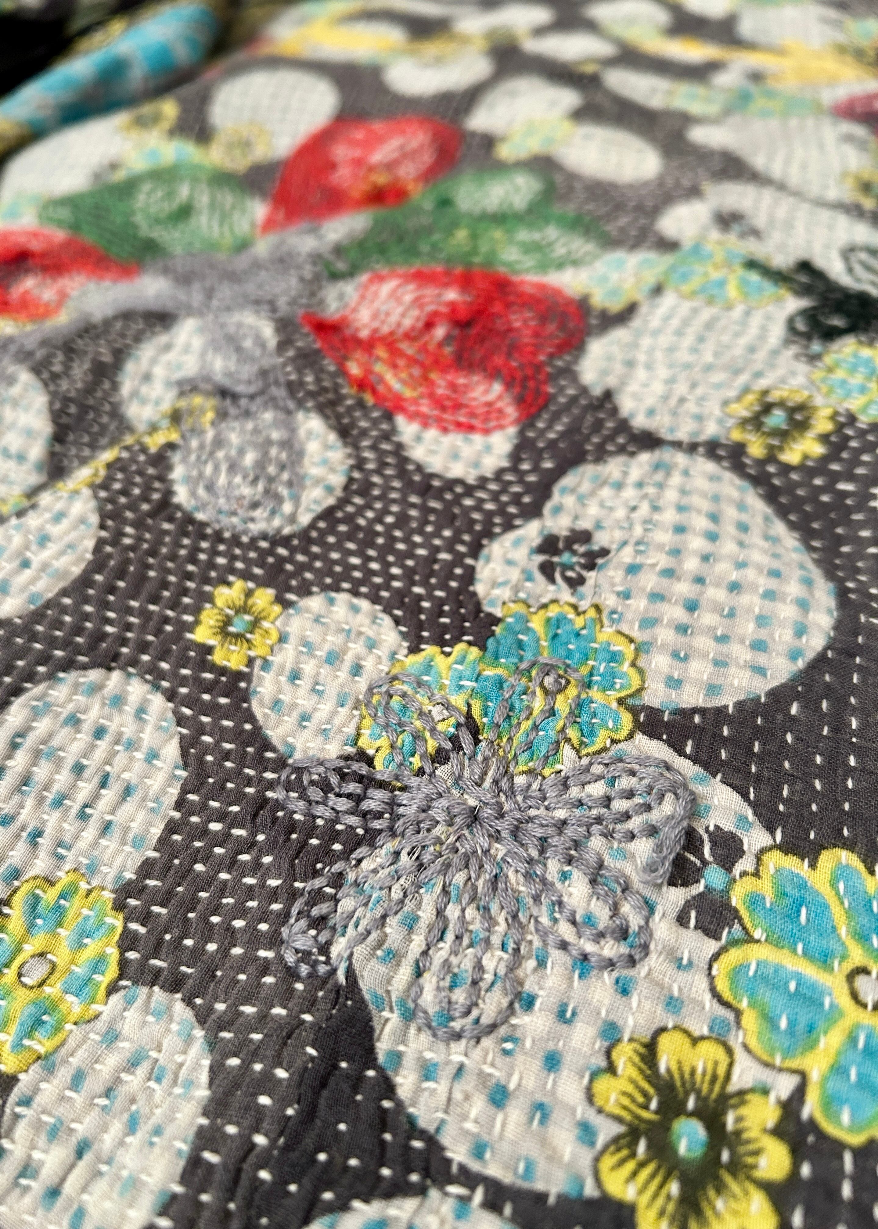 カンタキルトの細かい刺し子の刺繍に加え、太いかぎ針を使って草花・果実・鳥や太陽などの絵柄を大胆に刺繍で表現し、カンタキルトがより一層アートな1枚に変身しています。