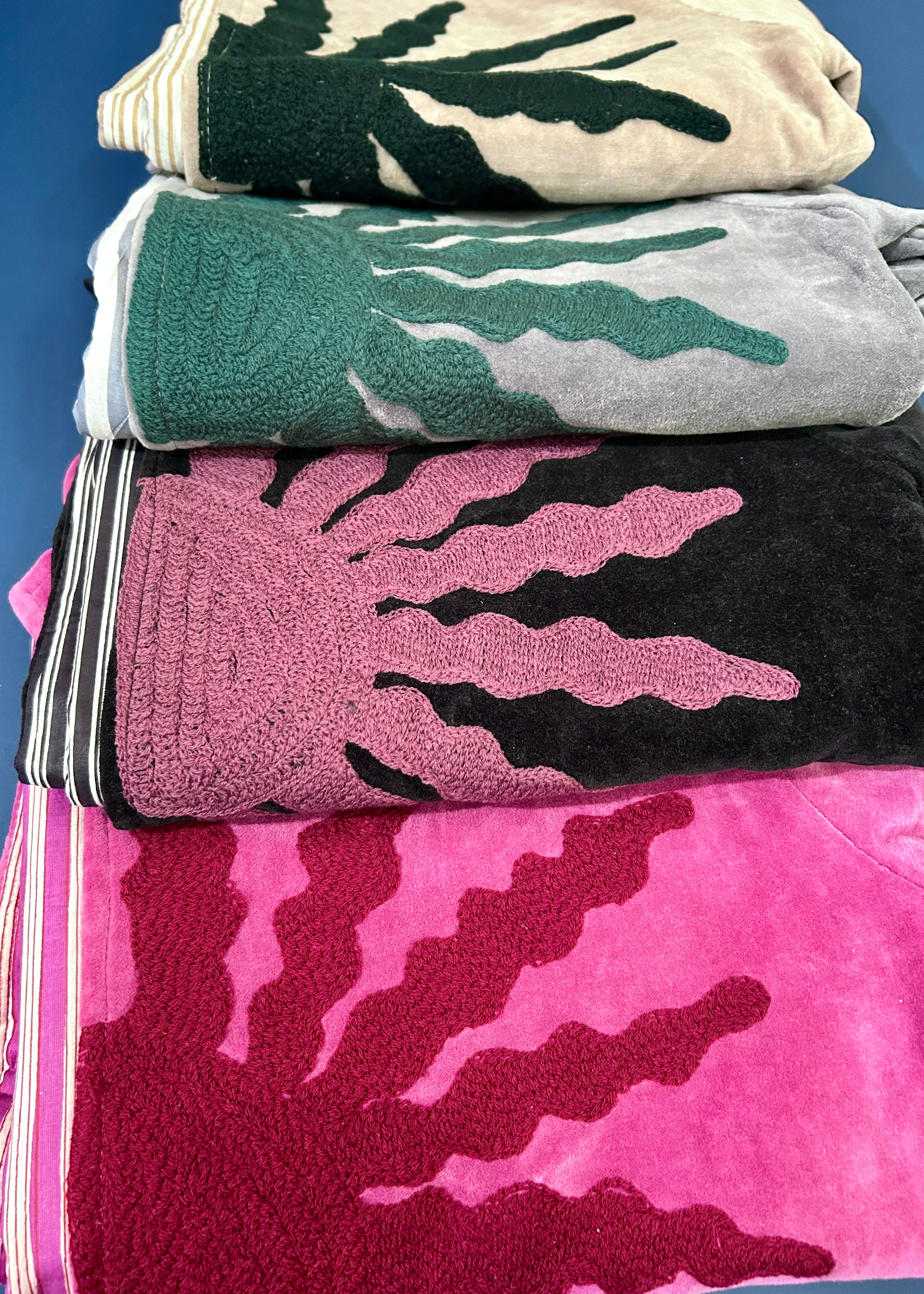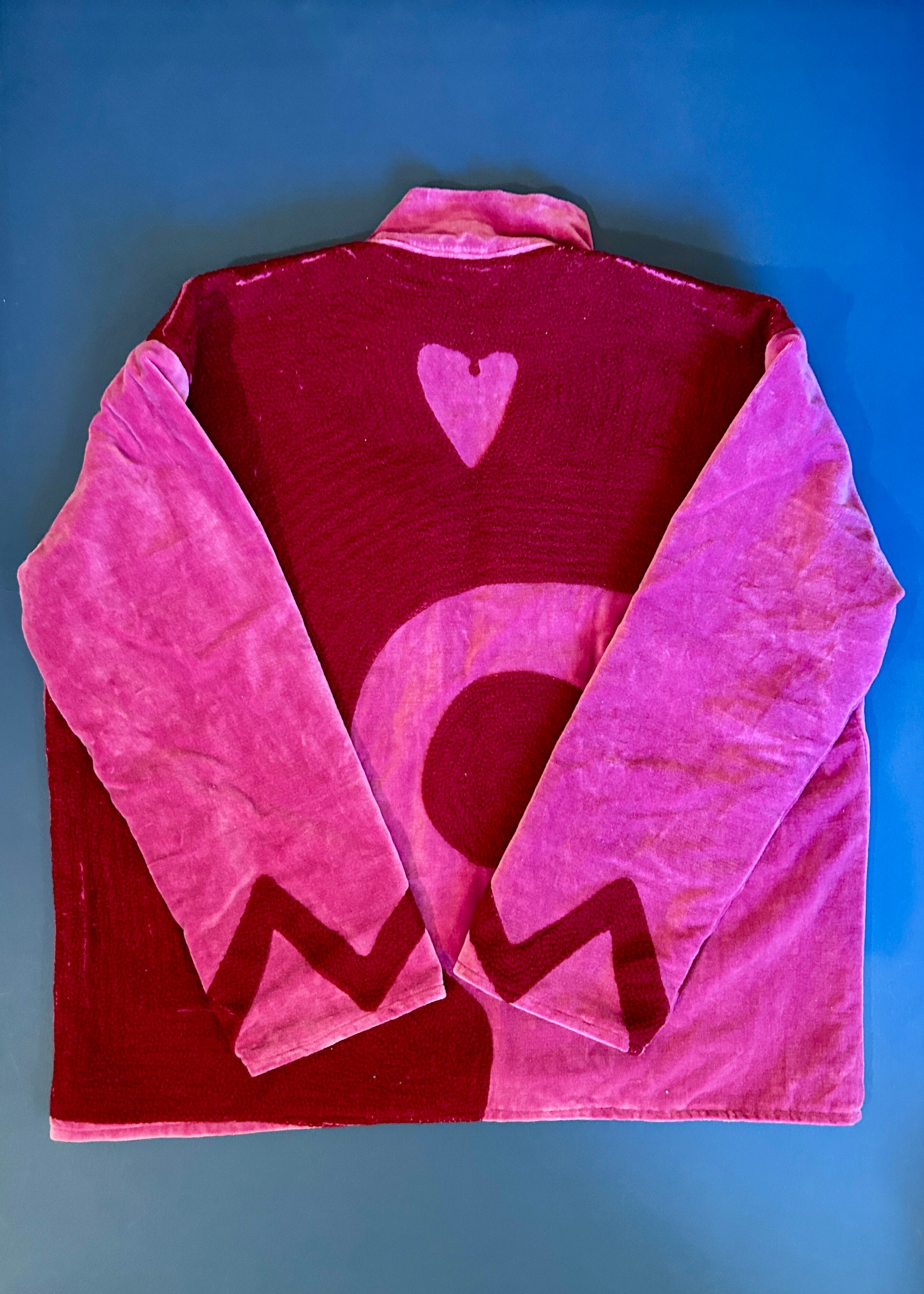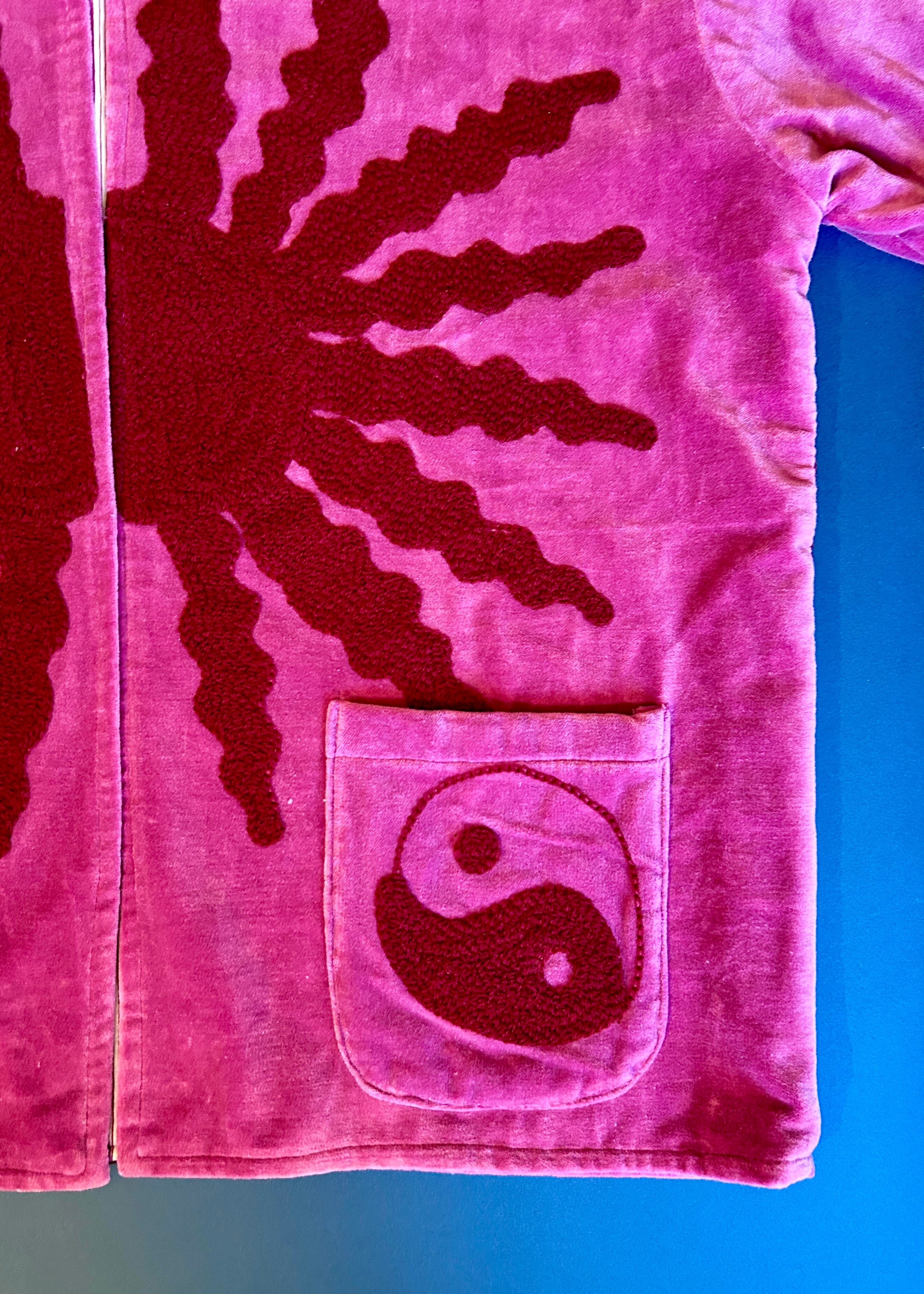 コットンベルベット素材のジャケットに、太陽と陰陽モチーフが太いかぎ針を使ったアリ刺繍(スザニ刺繍)で大胆に表現されたハンドメイドプロダクト。