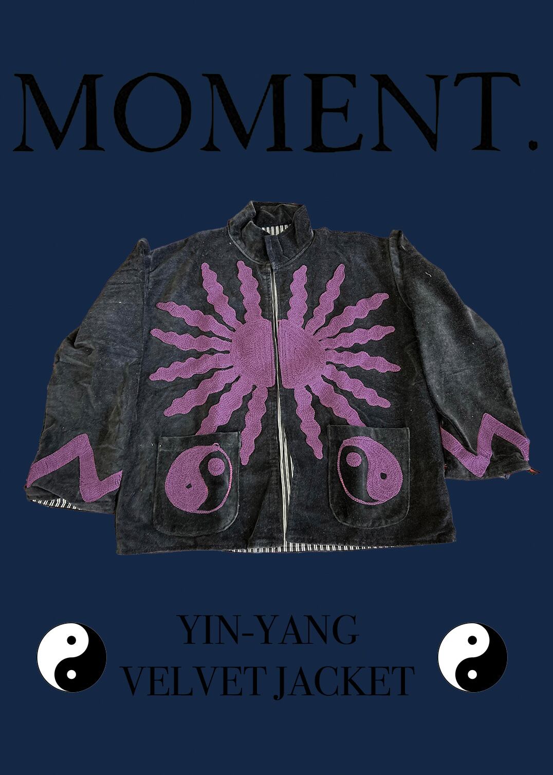 コットンベルベット素材のジャケットに、太陽と陰陽モチーフが太いかぎ針を使ったアリ刺繍(スザニ刺繍)で大胆に表現されたハンドメイドプロダクト。