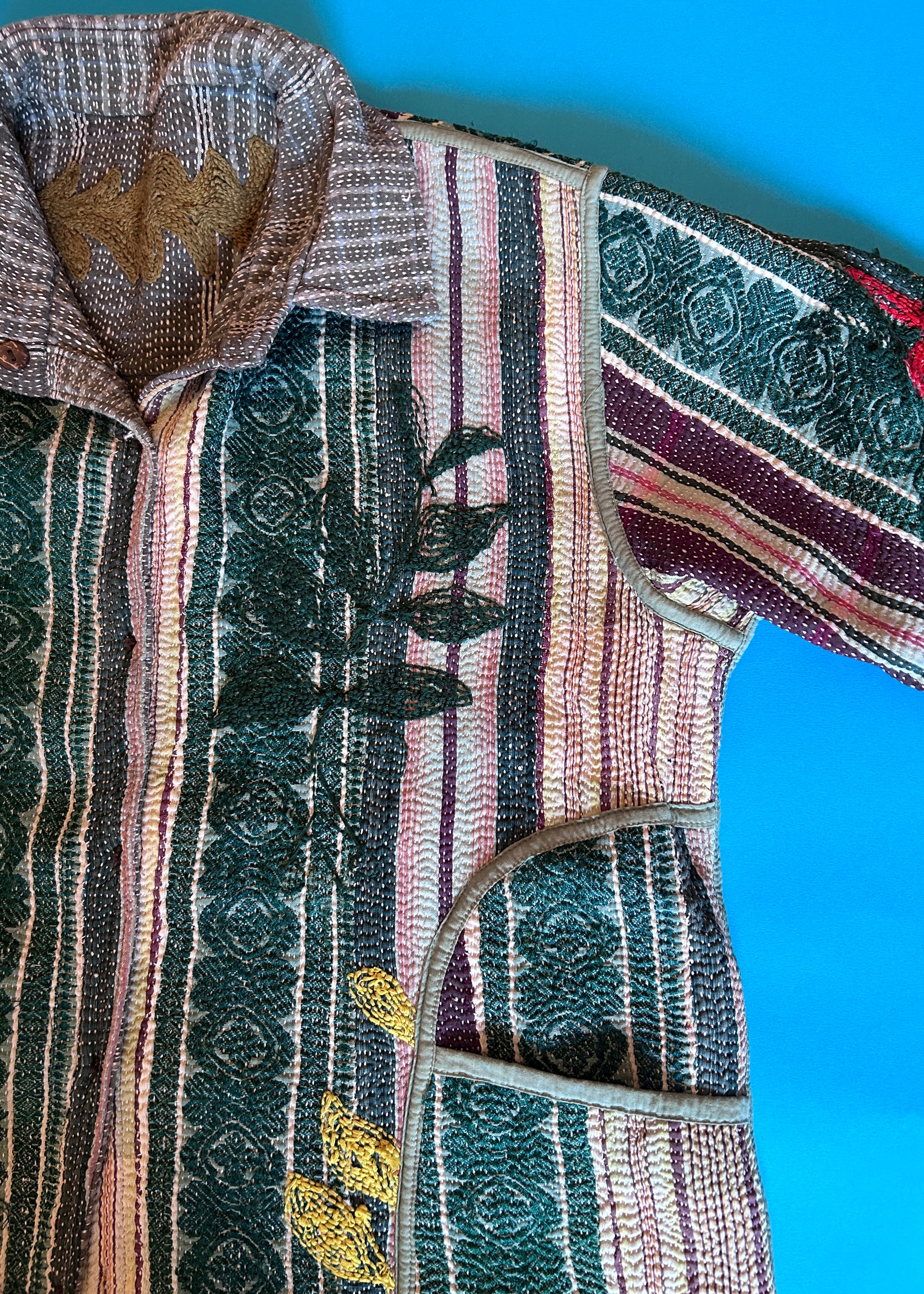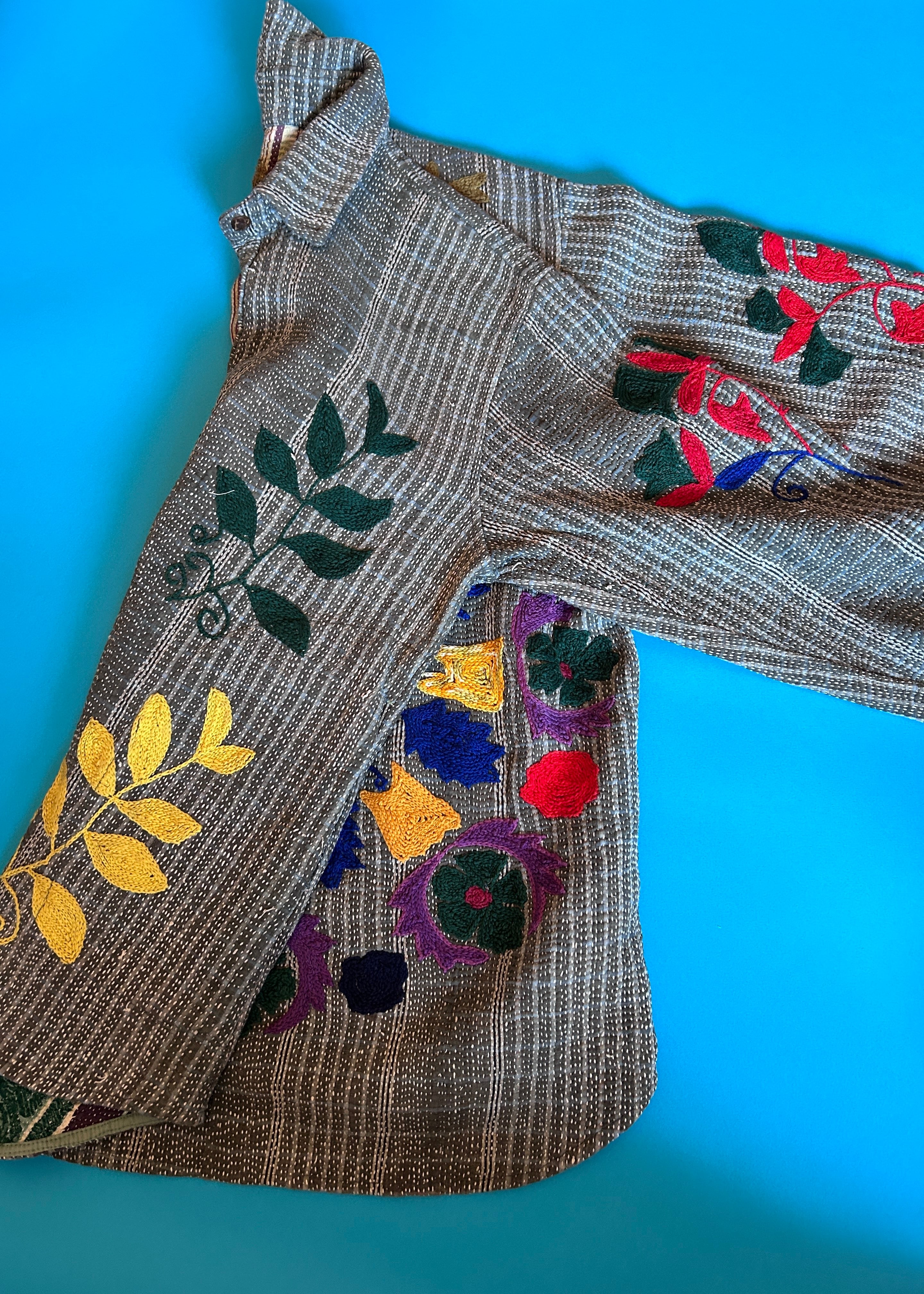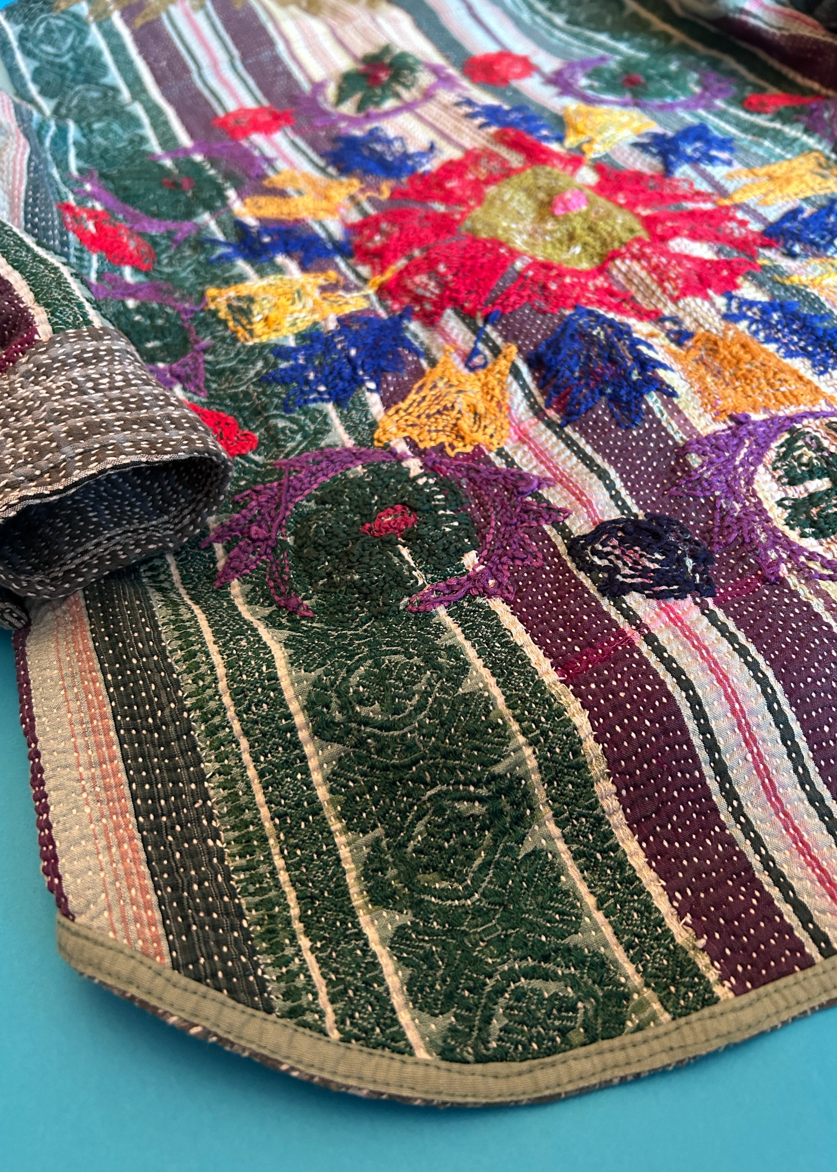 テキスタイル大国インド、ラジャスタン州のジャイプール。カンタキルトを数百枚と物色する中、一際目を惹いたのが、ヴィンテージのカンタキルトにカシミール刺繍(東アジアではアリ刺繍・スザニ刺繍とも呼ばれる)が施されたプロダクトです。