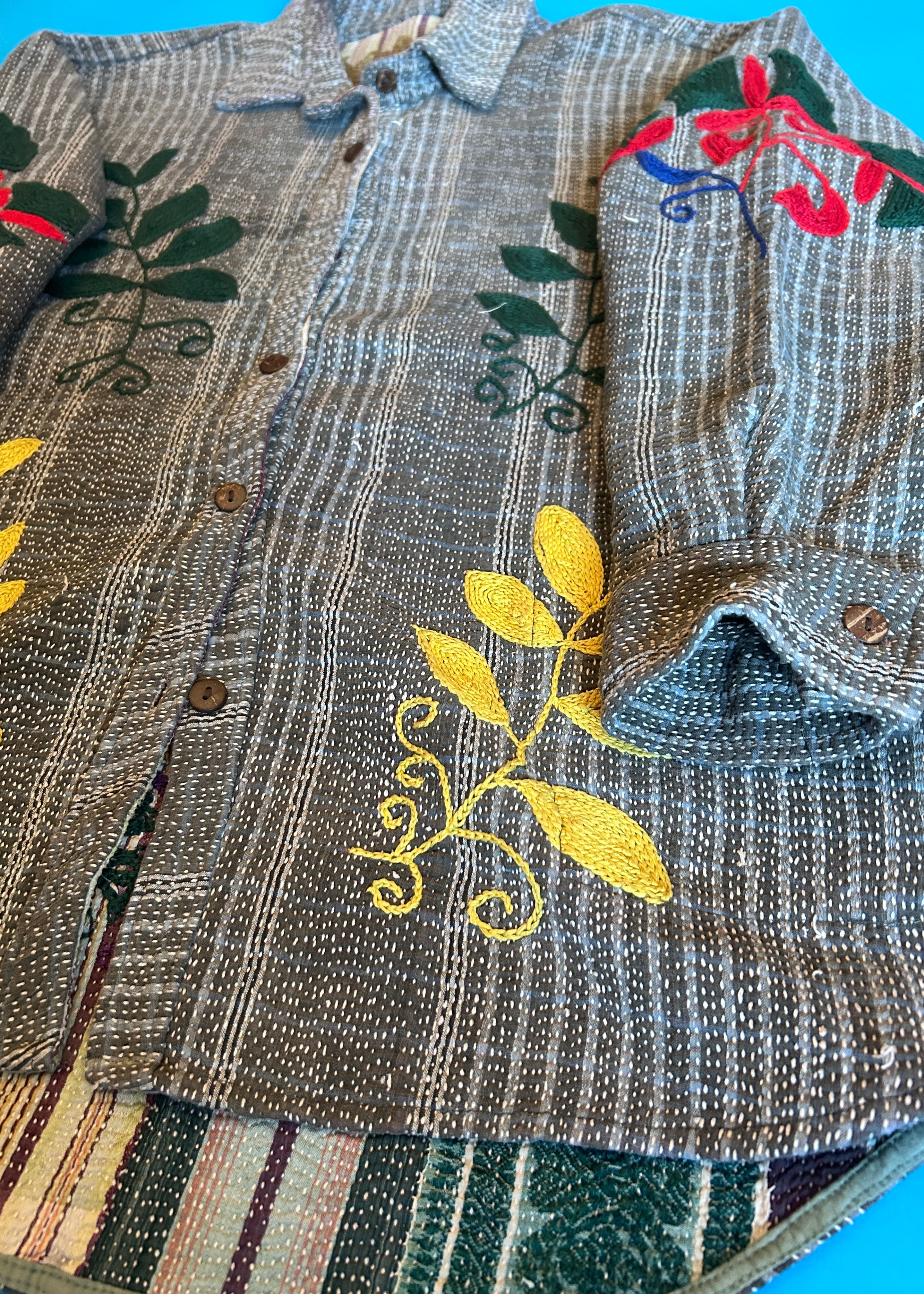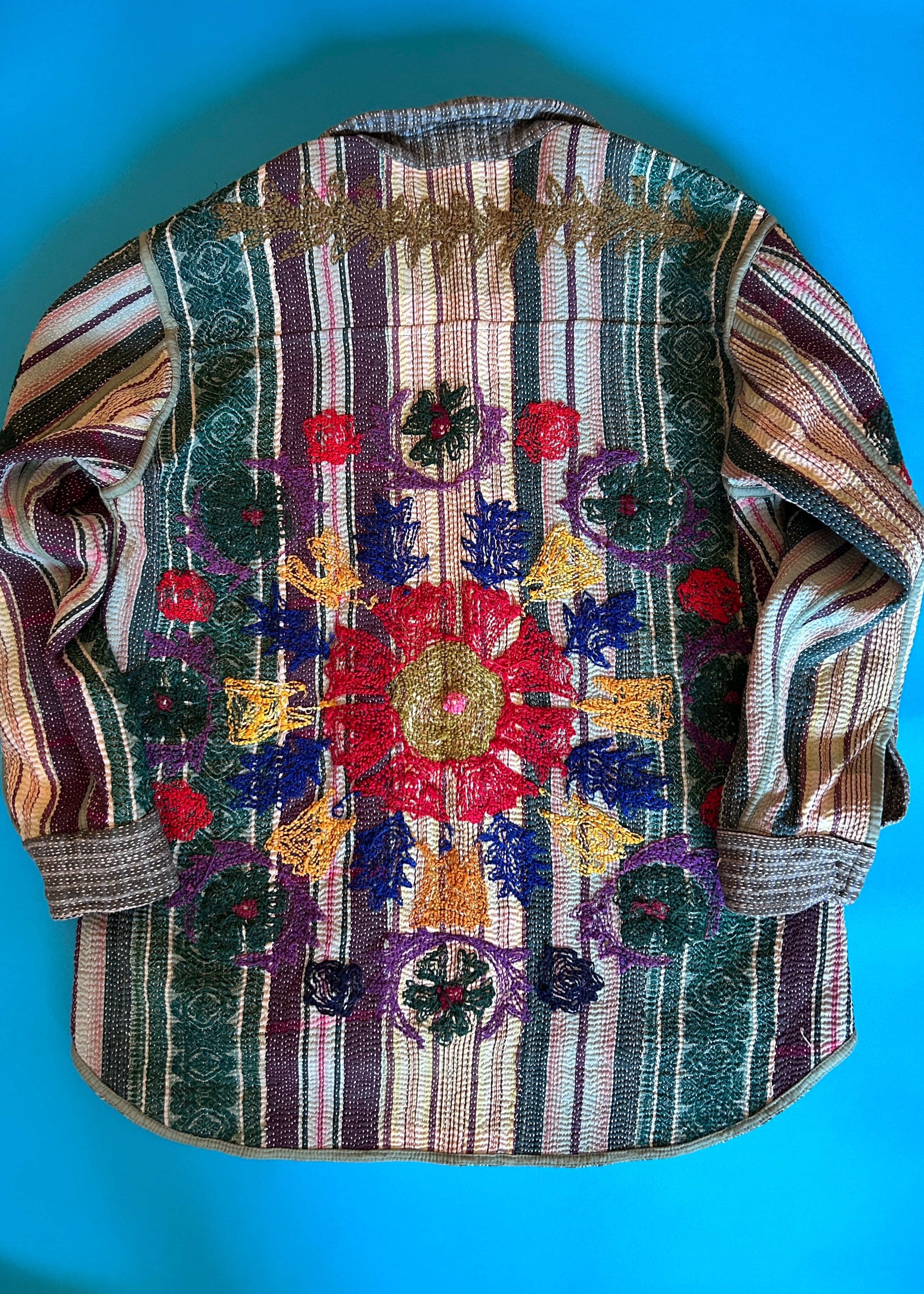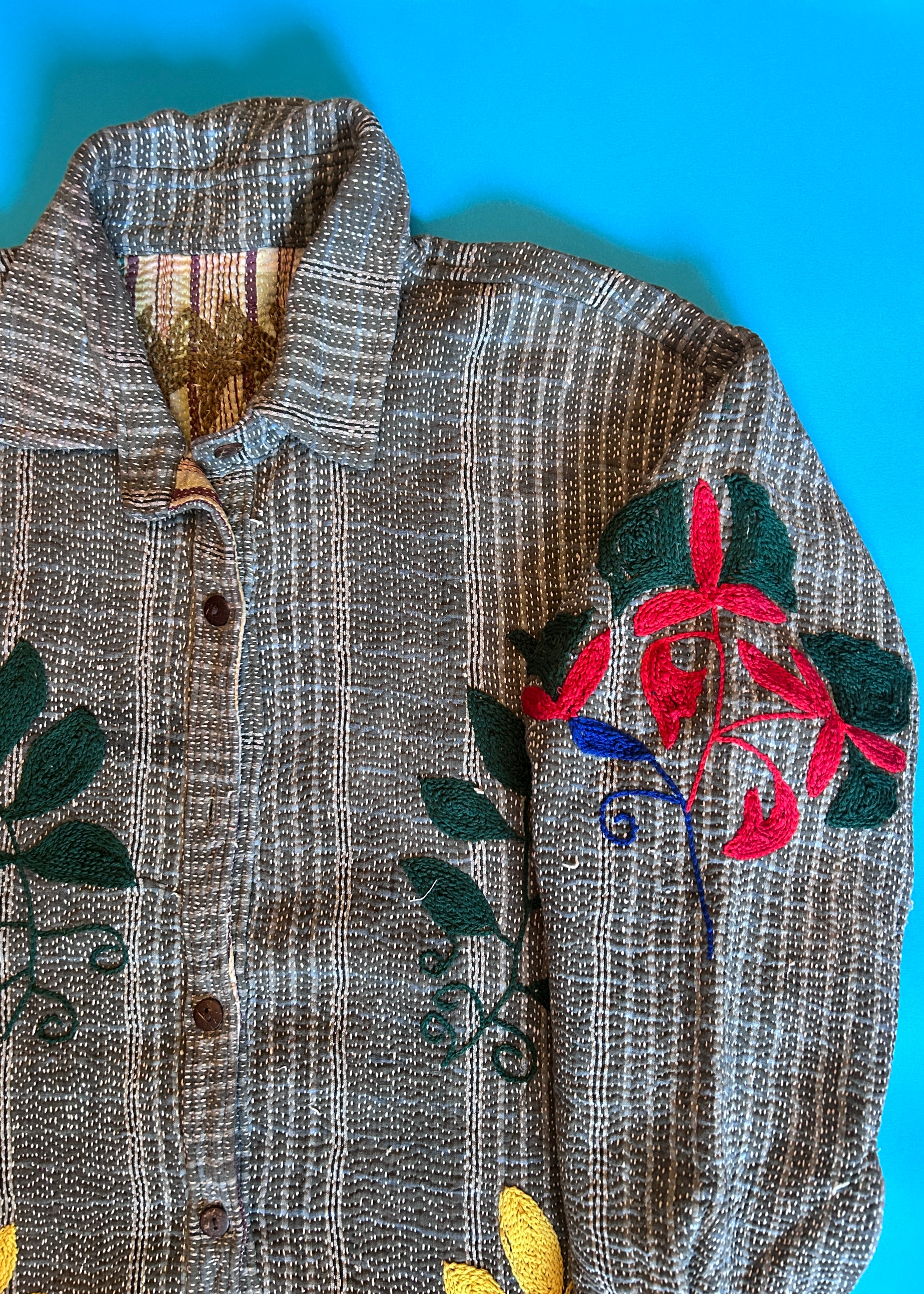 テキスタイル大国インド、ラジャスタン州のジャイプール。カンタキルトを数百枚と物色する中、一際目を惹いたのが、ヴィンテージのカンタキルトにカシミール刺繍(東アジアではアリ刺繍・スザニ刺繍とも呼ばれる)が施されたプロダクトです。