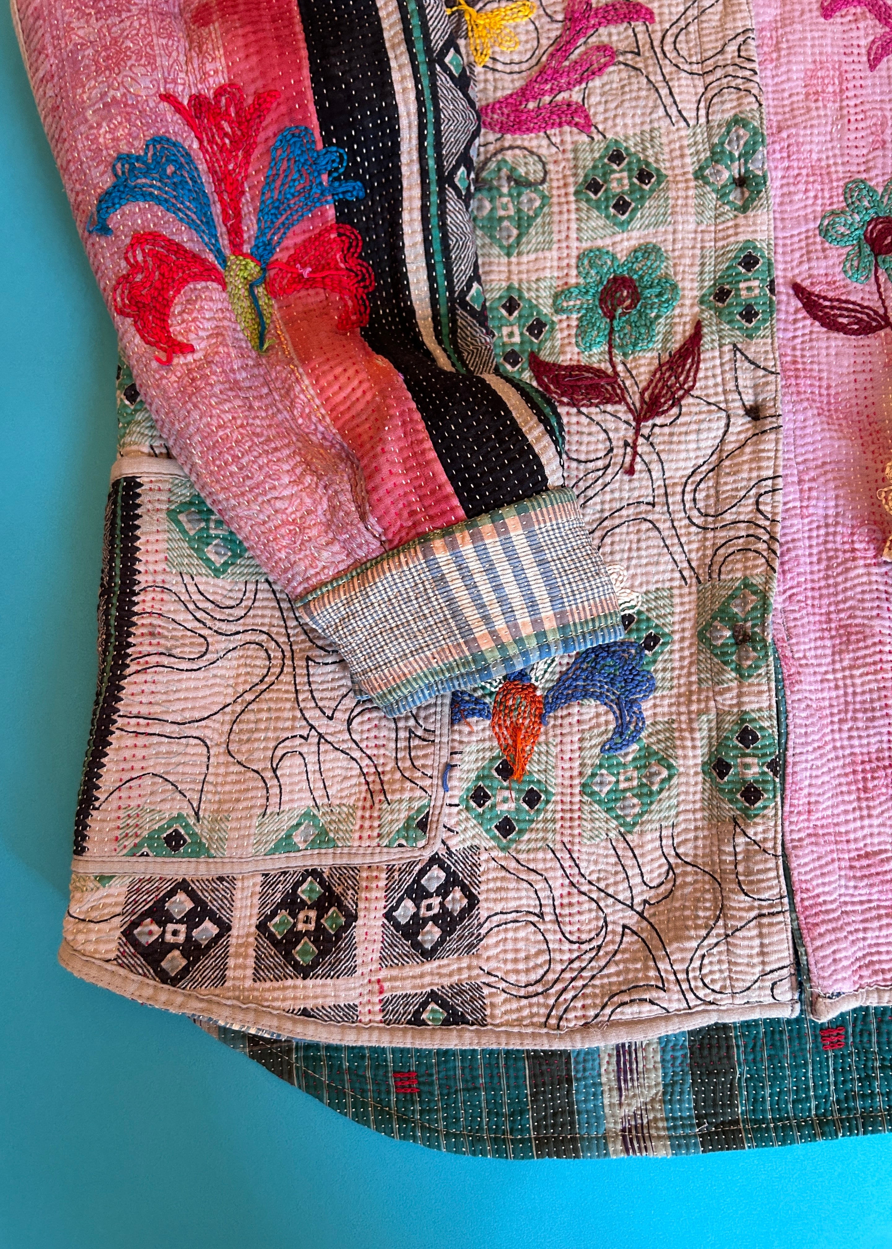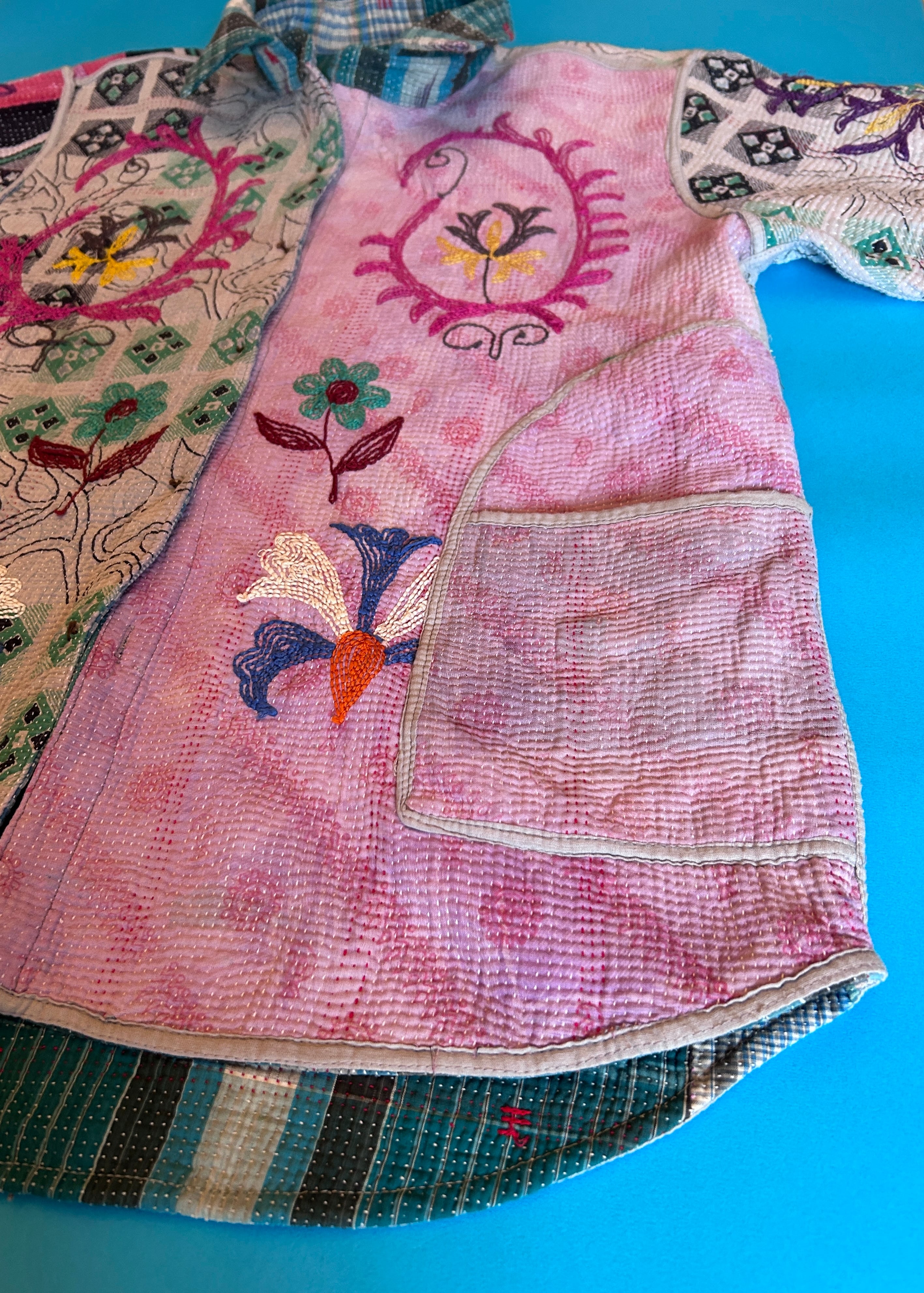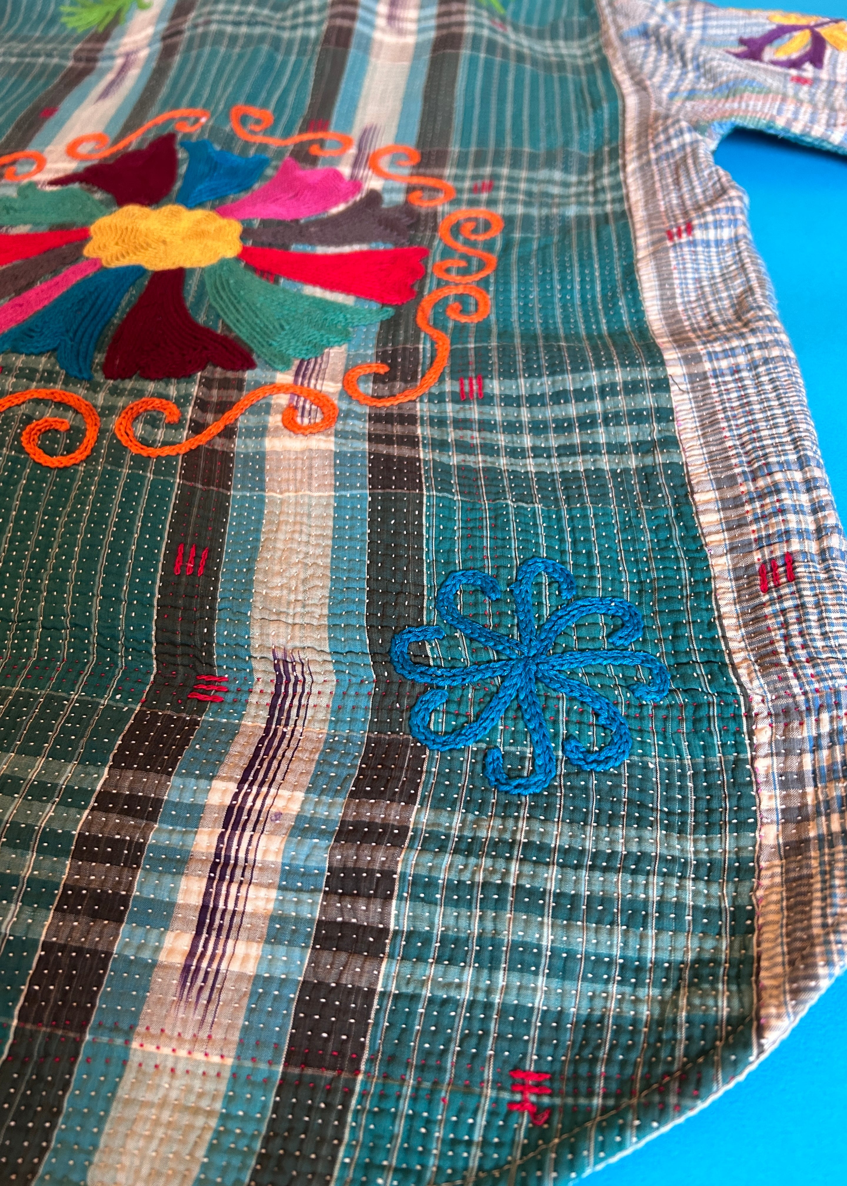テキスタイル大国インド、ラジャスタン州のジャイプール。カンタキルトを数百枚と物色する中、一際目を惹いたのが、ヴィンテージのカンタキルトにカシミール刺繍(東アジアではアリ刺繍・スザニ刺繍とも呼ばれる)が施されたプロダクトです。