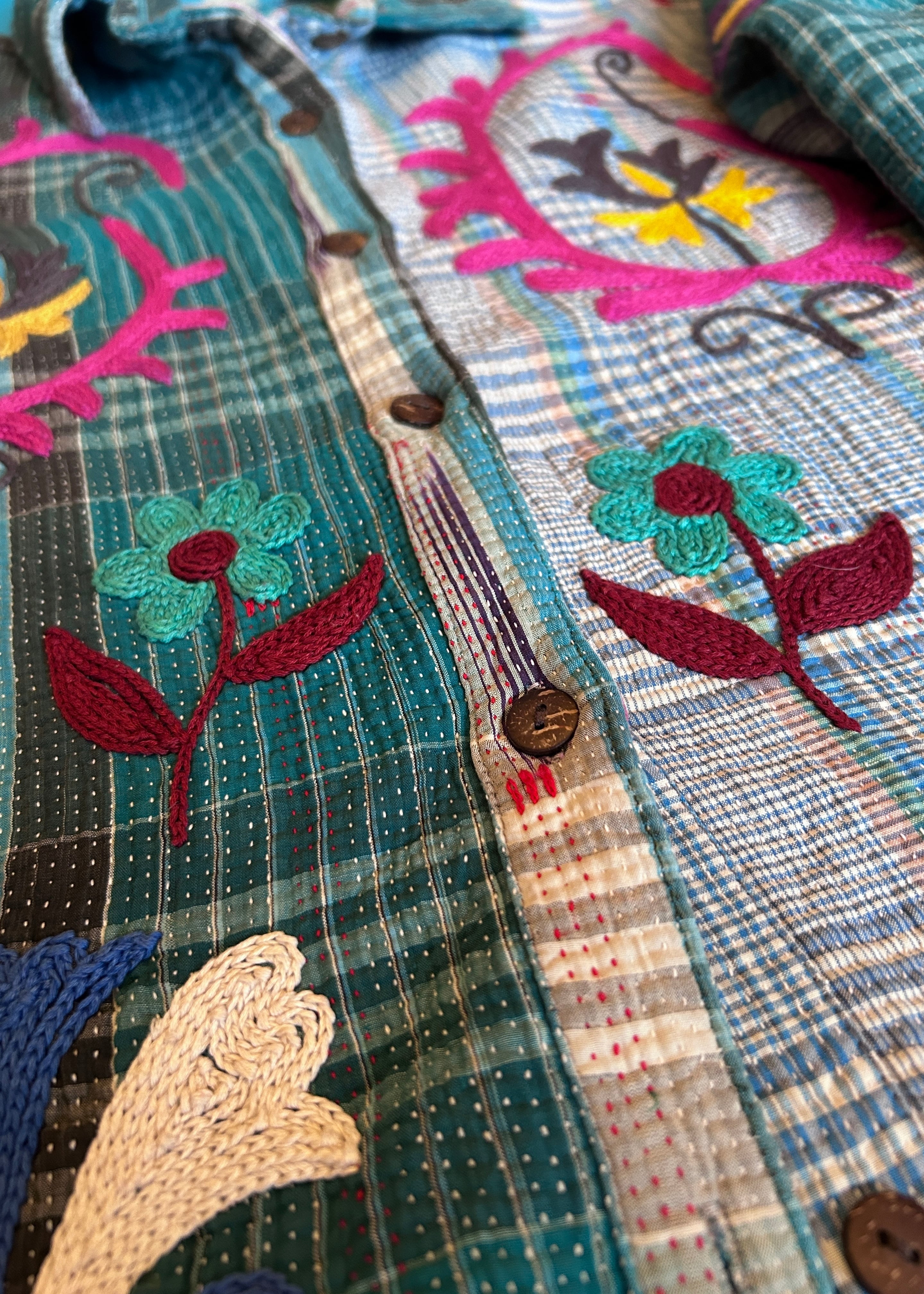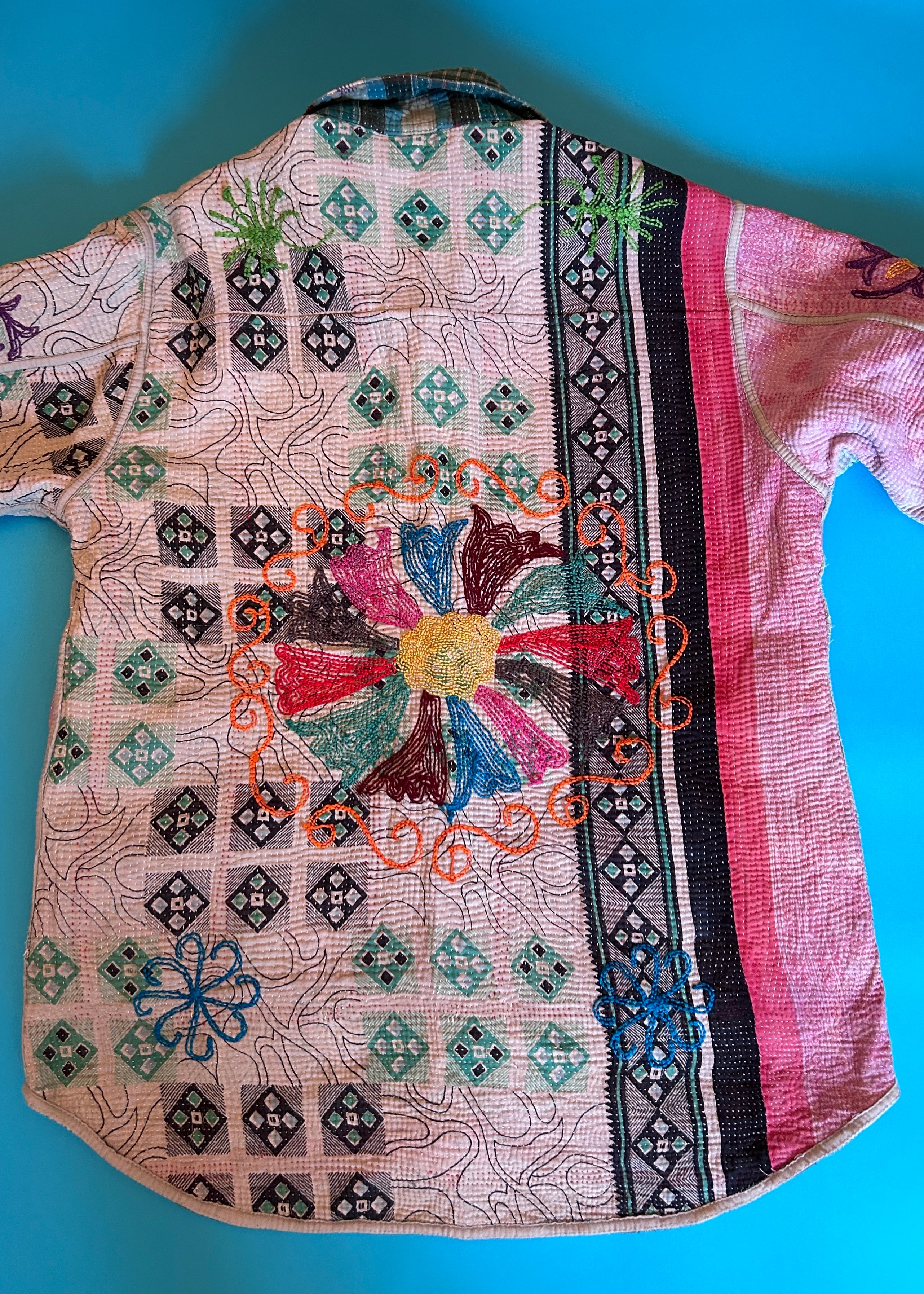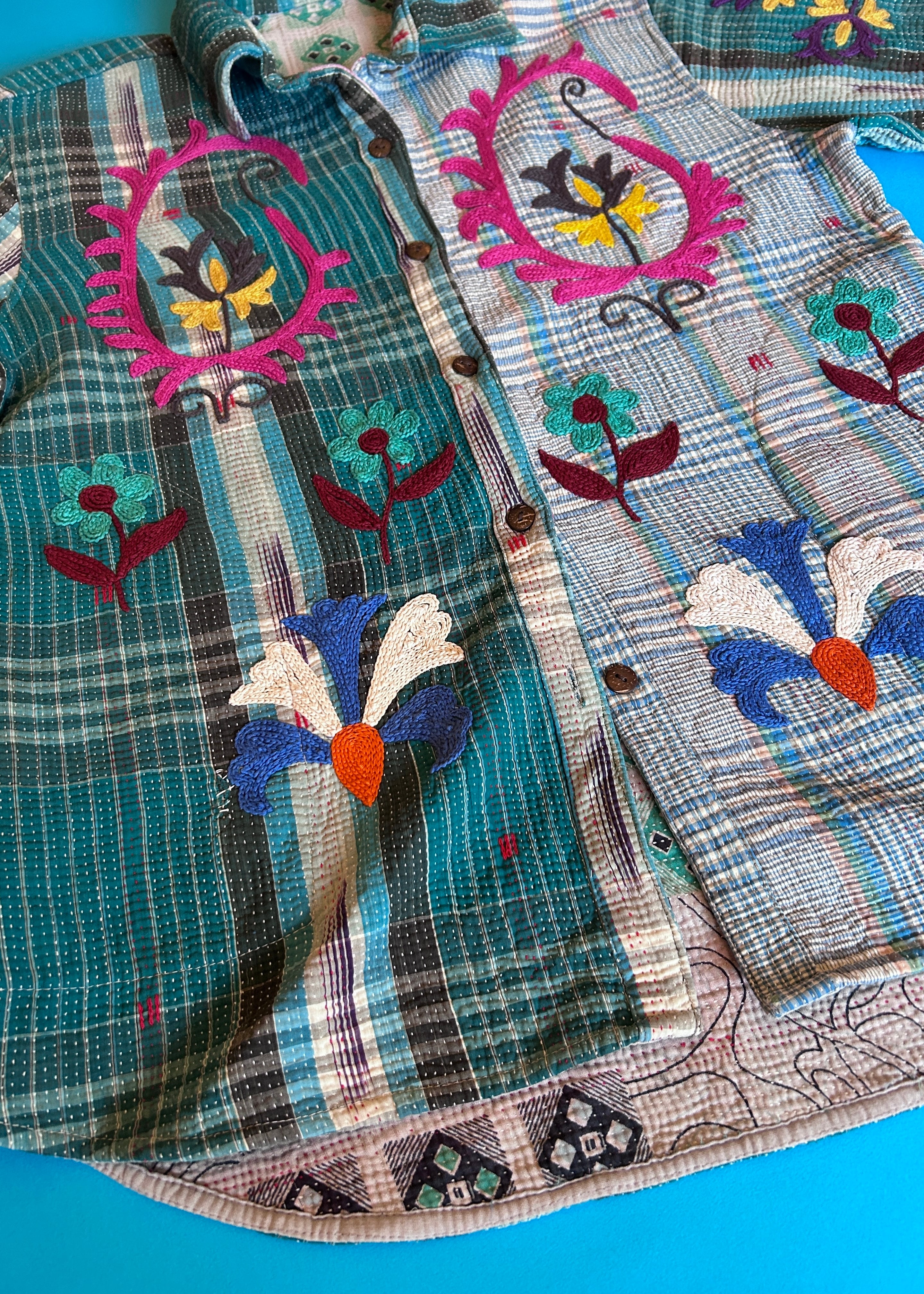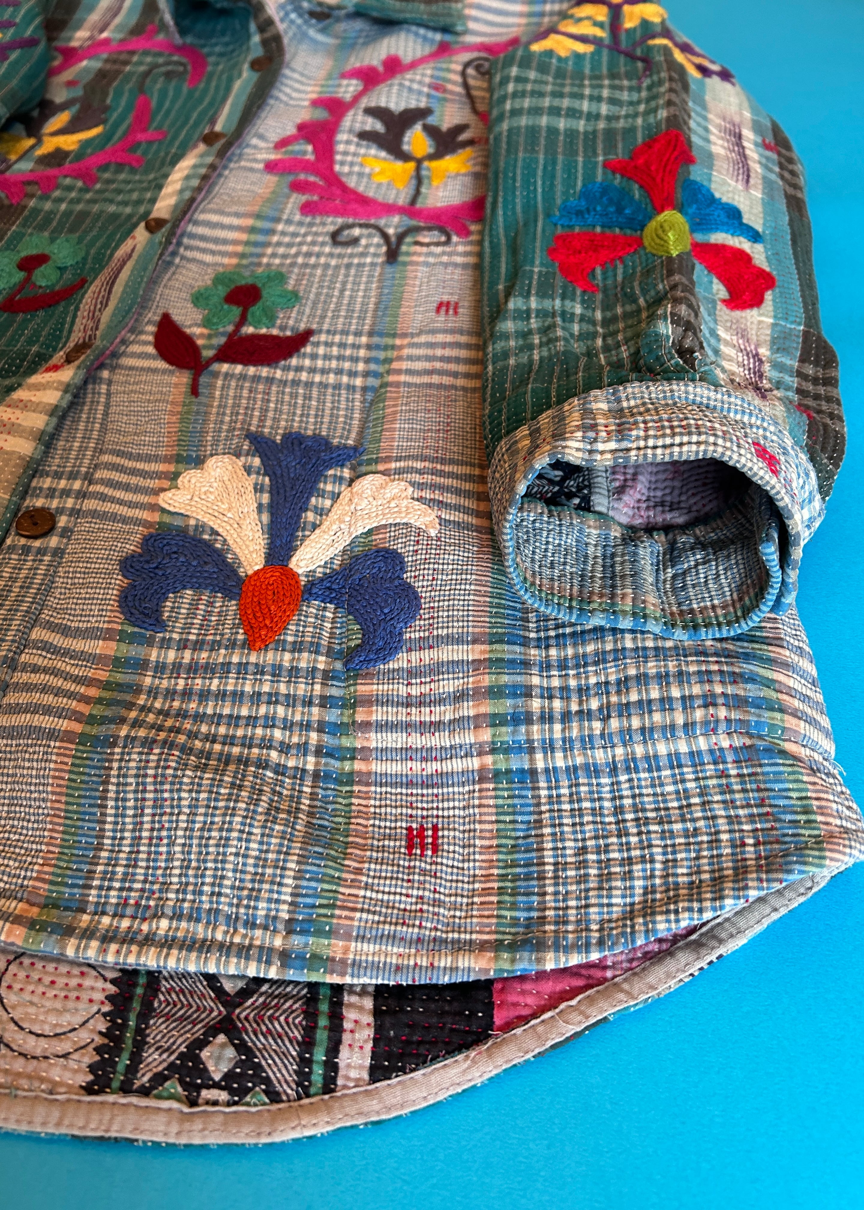 テキスタイル大国インド、ラジャスタン州のジャイプール。カンタキルトを数百枚と物色する中、一際目を惹いたのが、ヴィンテージのカンタキルトにカシミール刺繍(東アジアではアリ刺繍・スザニ刺繍とも呼ばれる)が施されたプロダクトです。