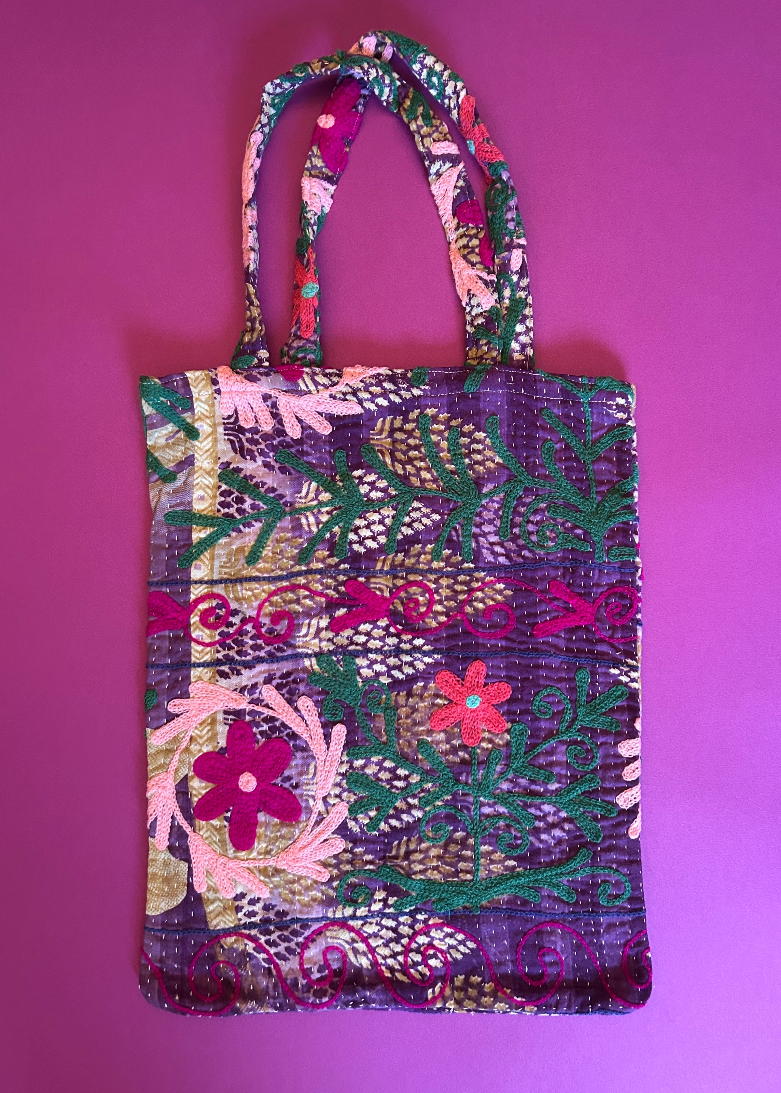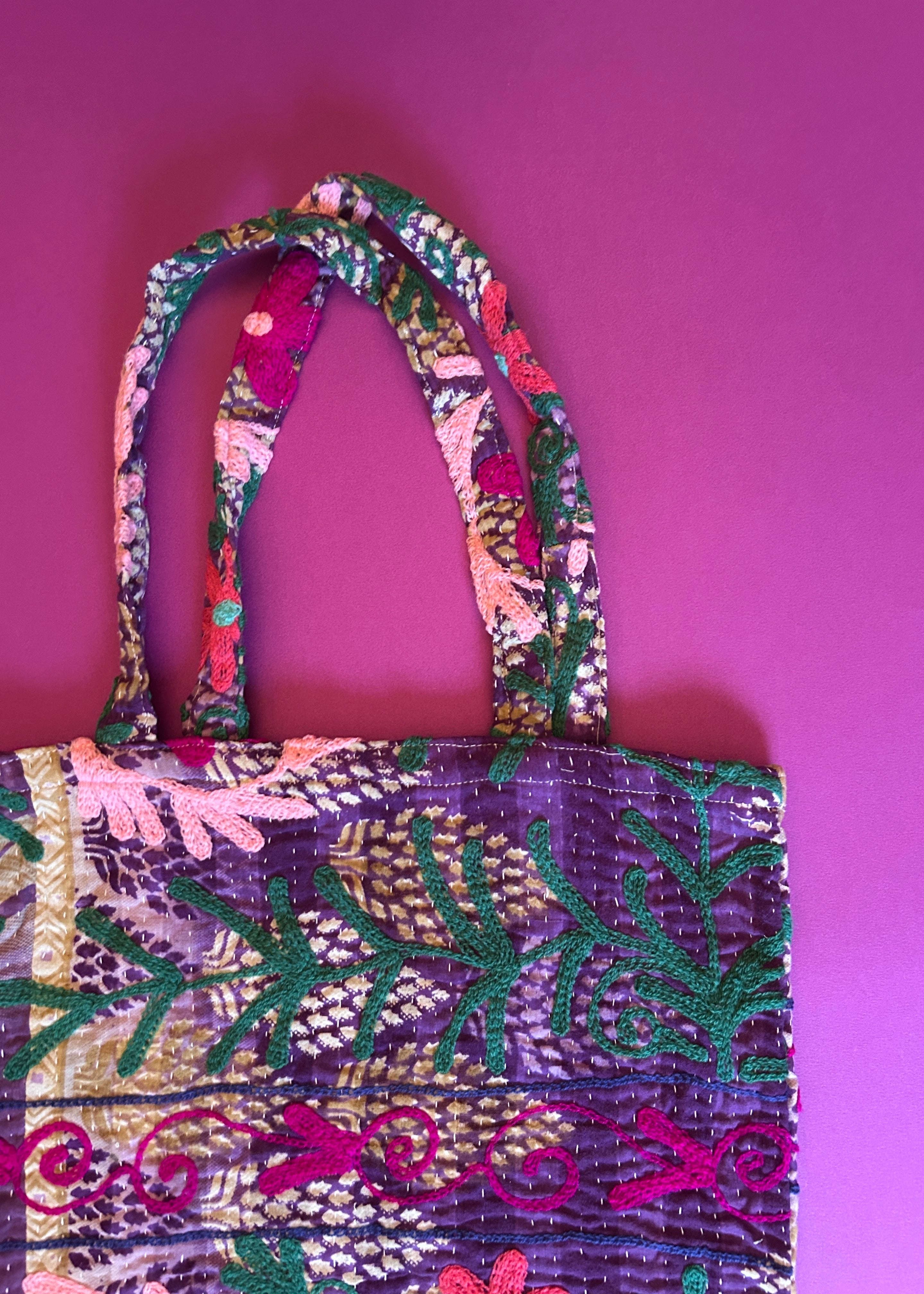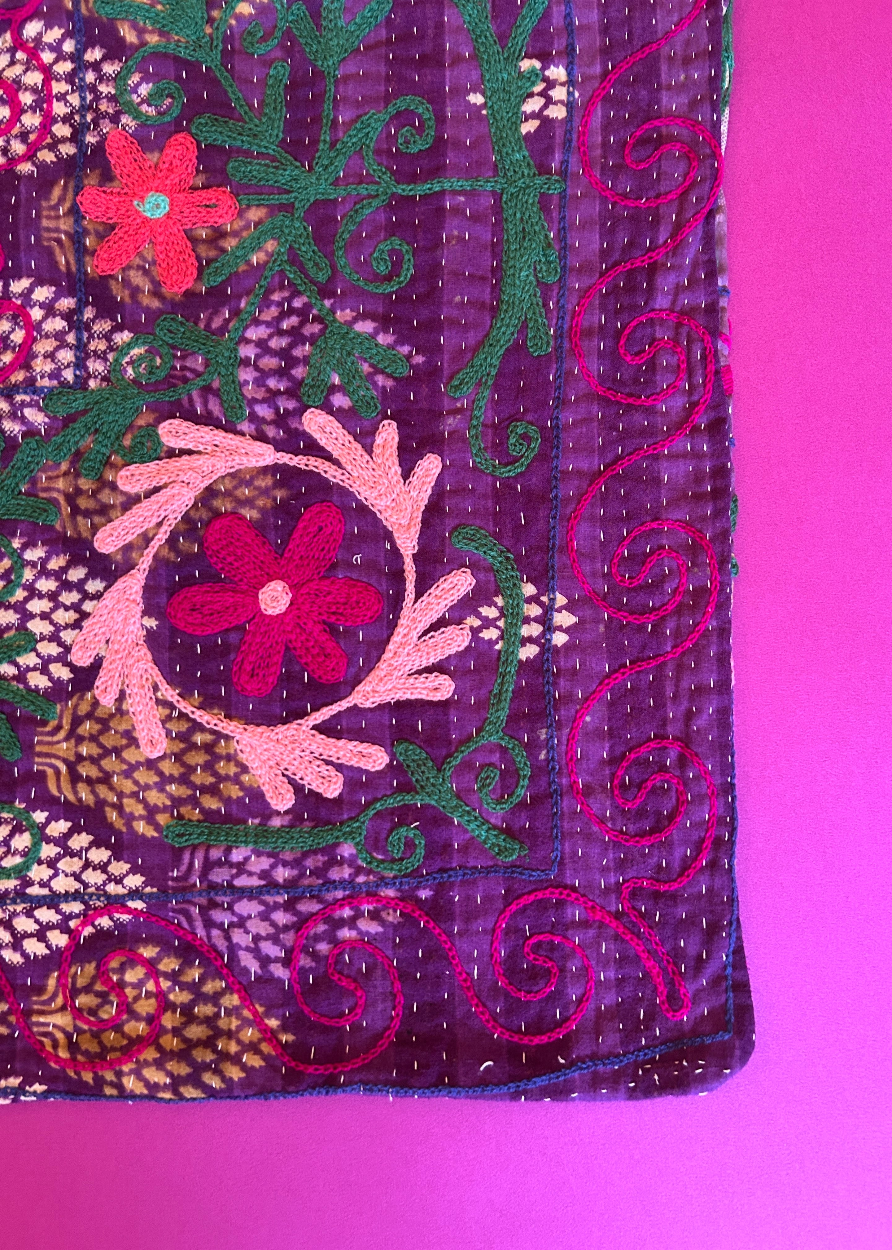 カンタキルトに鮮やかなアリ刺繍でスザニが施され、同じものはないすべて1点物のデザインになります。